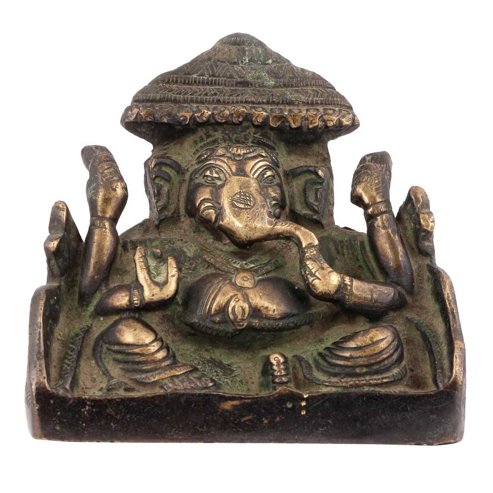 • Brass Ganesh Statue Sitting on Throne in Royal Easy Posture Blessing