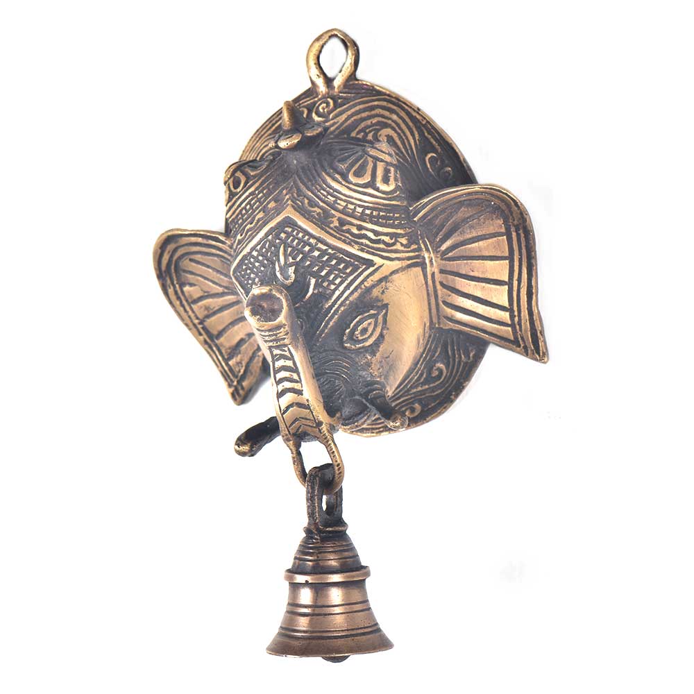Lovely handmade brass wall hanging with elephant head with a bell haging to its trunk. Switch off your electric door bell and opt for this old-style bell to ring in your guests and relatives.