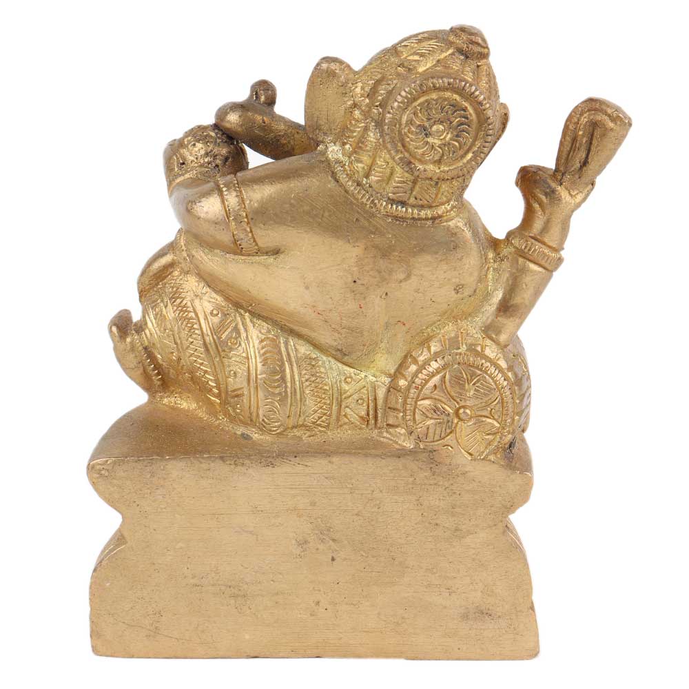 Handmade Bras Ganesha sitting next to a round pillow with a modak ( a sweet) in one hand on a round lotus base . Lord Ganesha is known as the remover of obstacle and god of wisdom. Diwali gift, new year gift, marriage gift, temple worship, stage decoration and house warming gift.