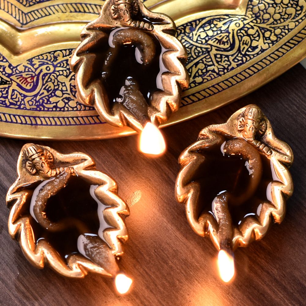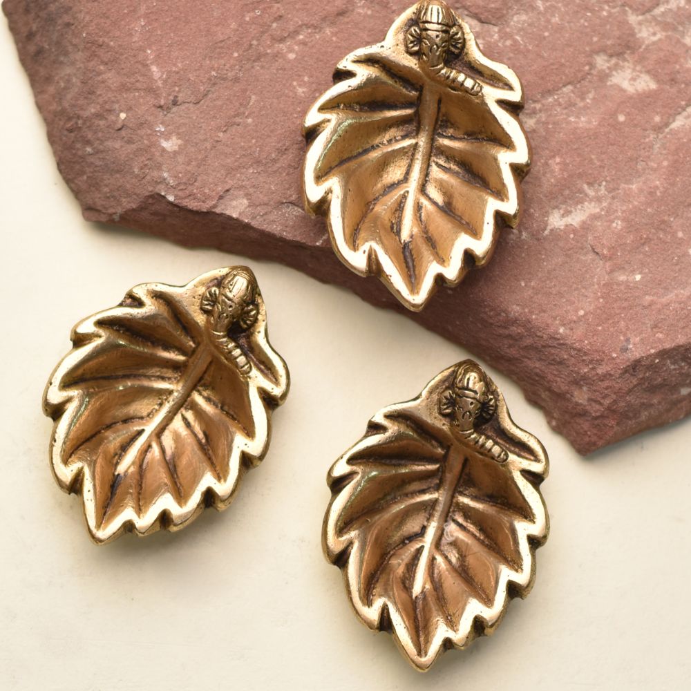 Illuminate your home with divine blessings using this Brass Ganpati and Leaf Shape Diya. Beautifully handcrafted in solid brass, it features Lord Ganesha seated on an elegant leaf design, symbolizing prosperity, wisdom, and auspicious beginnings. With its golden finish and compact size, it is perfect for Diwali rituals, temple use, and spiritual décor.