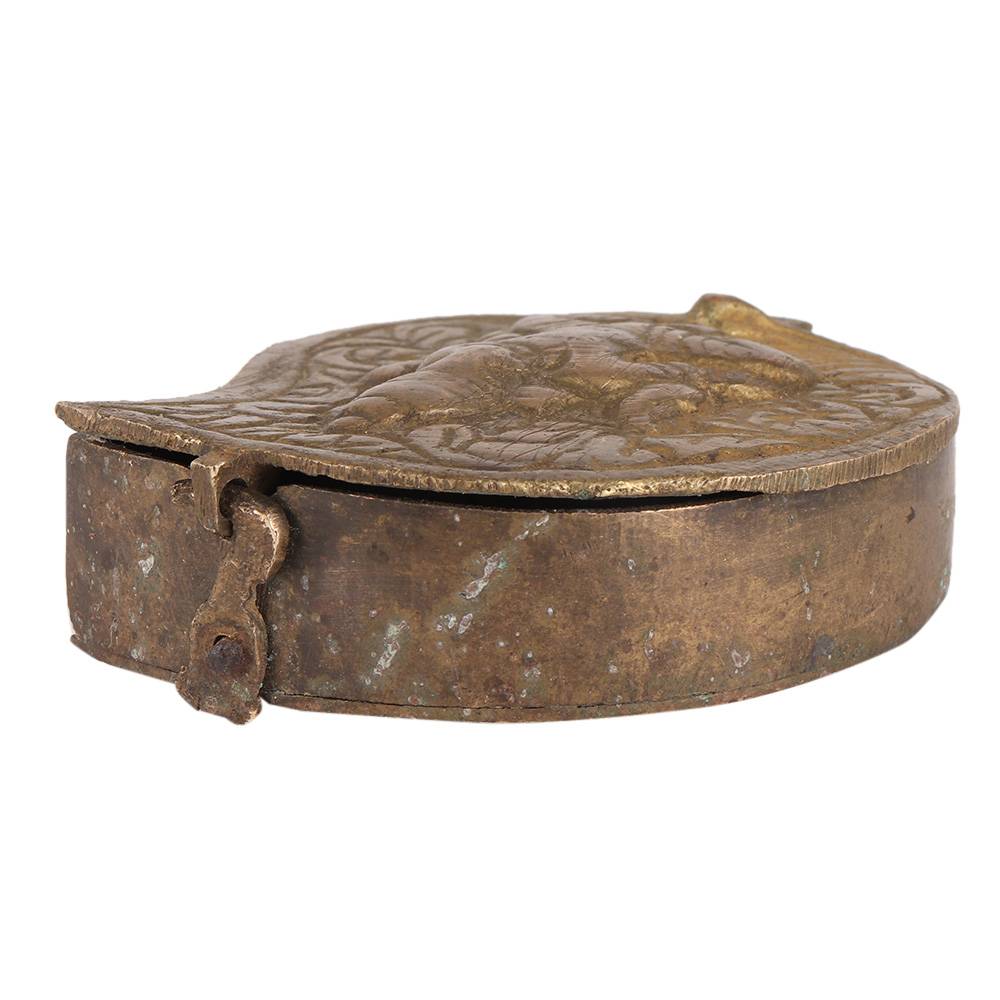 Ethnic Brass from India tika box with a Figurine of Ganesha for vermilion, kumkum,  as a collectible, saffron powder box, sadnal powder box and traditional Indian powder boxes. dresser table décor, vintage church decoration and hindu temple accessory. An ideal gift for your near and dear ones.