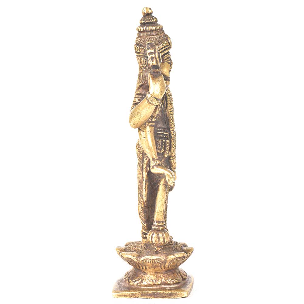 Goddess Laxmi standing on lotus is made of brass by the skilled craftsmen of India. Goddess laxmi is holding lotus in both her hands and in the other hand she is holding a gadha. This beautiful and finely engraved figurine can be used for gifting, decoration or for worshipping.