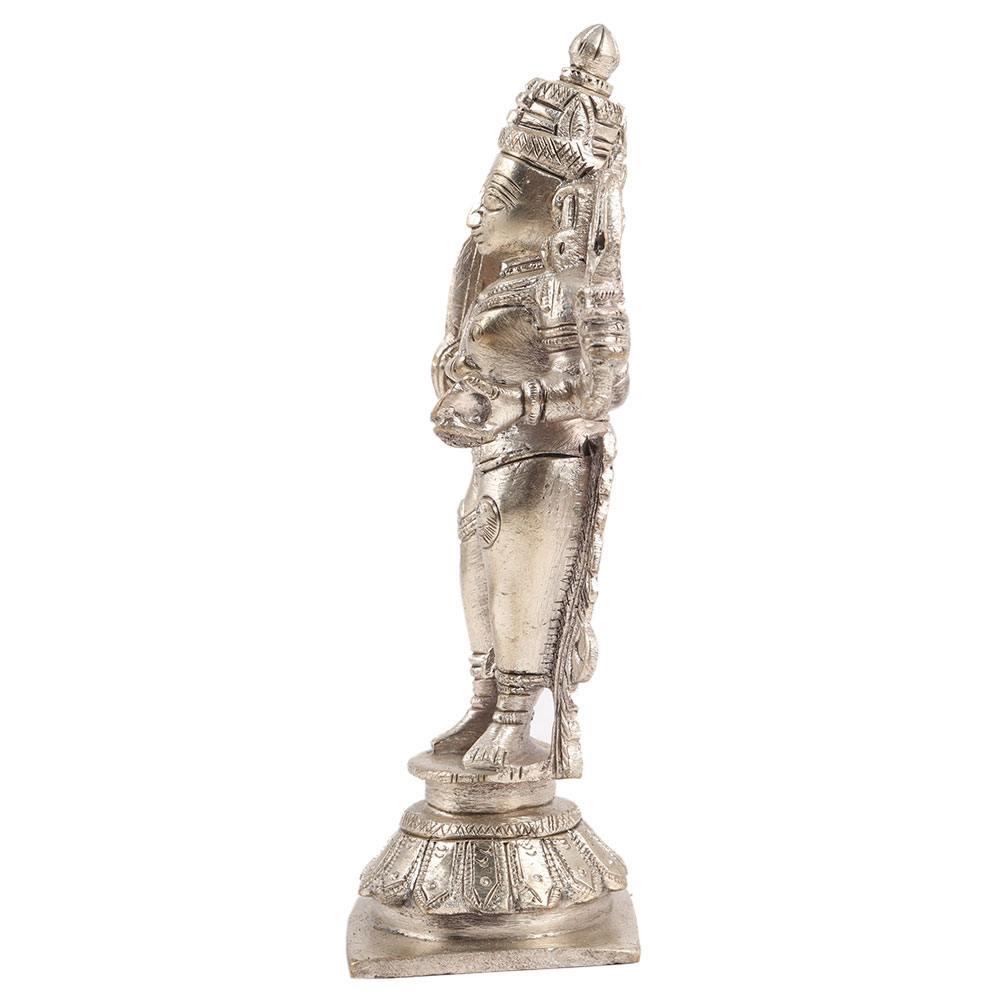 Beautiful brass statue of Goddess Mariamman standing. Mariamman is a Tamil folk goddess whose worship is thought to have begun in pre-vedic India. She is the most important Tamil mother goddess, especially in Tamil Nadu's rural areas. Amman means Mother, and Maari can mean either rain or smallpox. People usually worshipped her to protect them from smallpox, which was a major killer in the days before vaccinations. People sacrificed goats, sheep, and cocks to appease the Goddess. She was also worshipped by the ancient Dravidians in order to bring them rain, fertility, and thus prosperity.