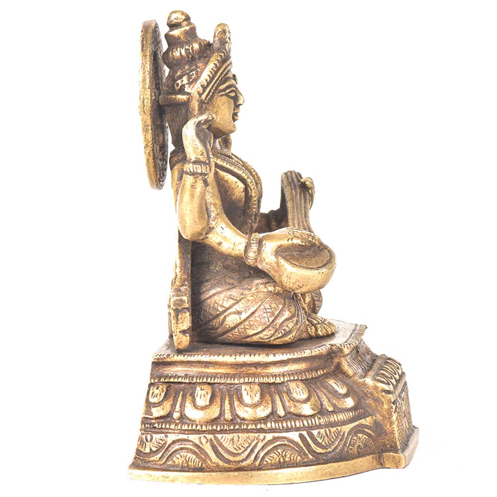 Goddess sarwasti is sitting on a raised platform with veena in her hand. This figurine is made of brass by the master craftsmen and this figurine has very finely done engravings which makes it more beautiful. It can be used for gifting, decoration or for worshipping.