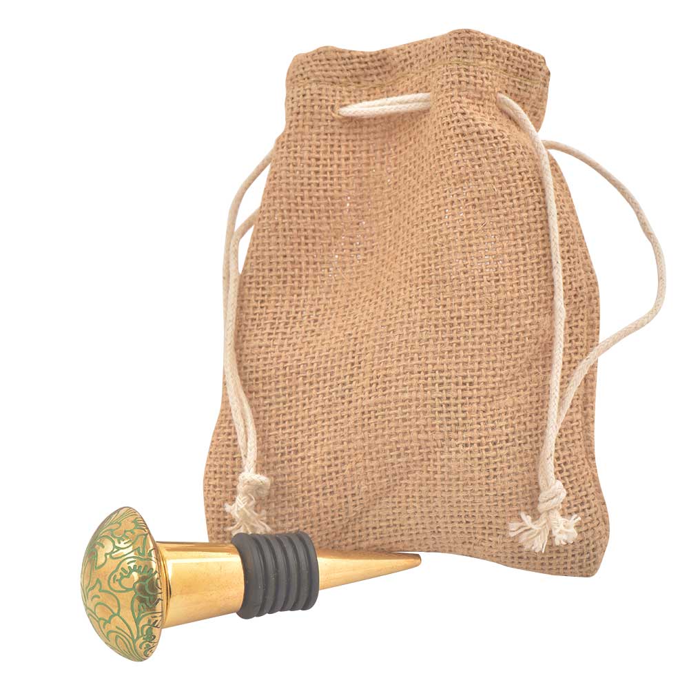 Brass Green Floral Wine Stopper. Zinc Alloy Wine Bottle Stopper with Attractive Jute Bag Packaging.