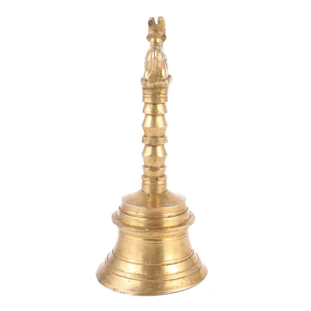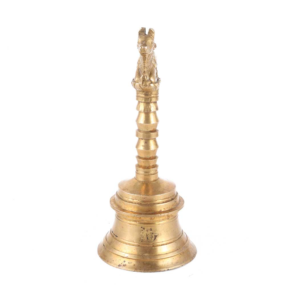 When rung, this bell is composed of brass and generates lengthy pure strains of sound. A Nandi figure sits atop the Bell. To achieve the correct finish, each piece is handcrafted and carved.