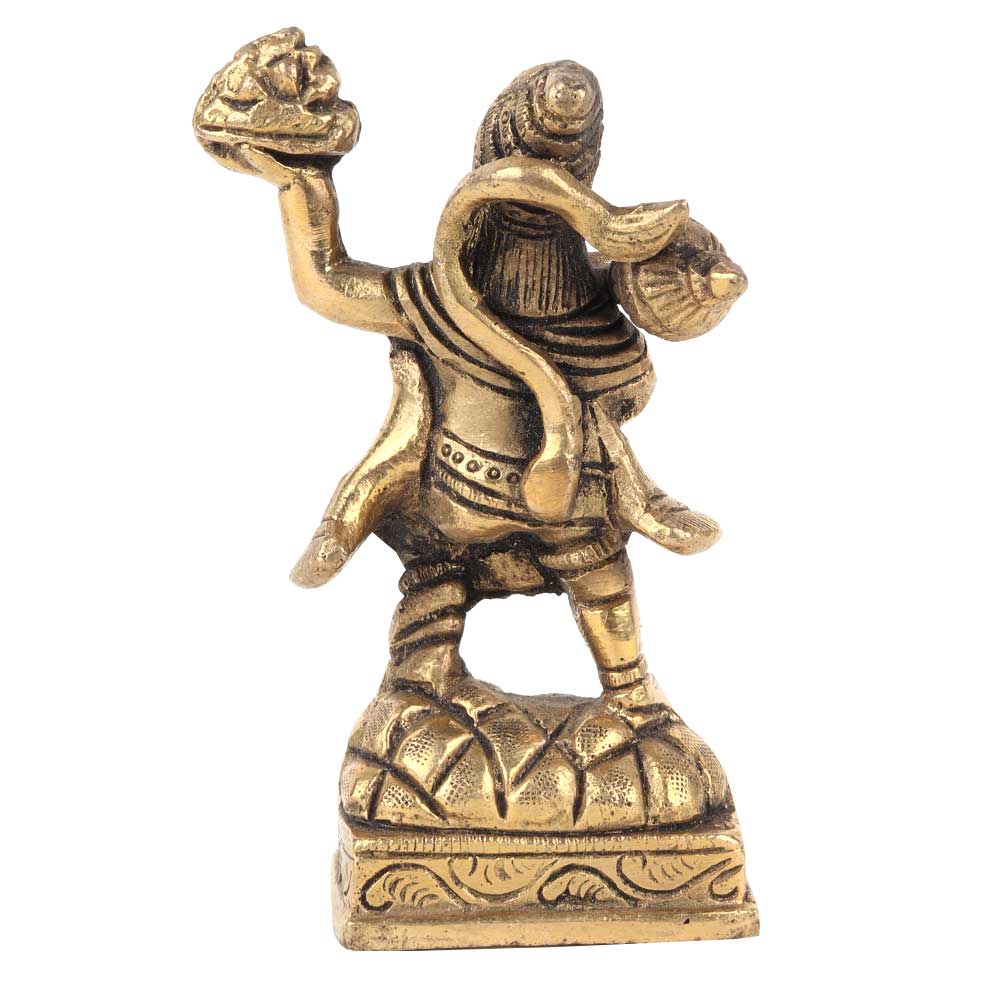 Lord Hanuman was an ardent devotee of lord Rama and an incarnation of Lord Shiva . This brass statue depicts lord hanuman holding the mountain of herb in one hand ( sanjeevani booti) to save the life of lord ram's brother lakshman.
