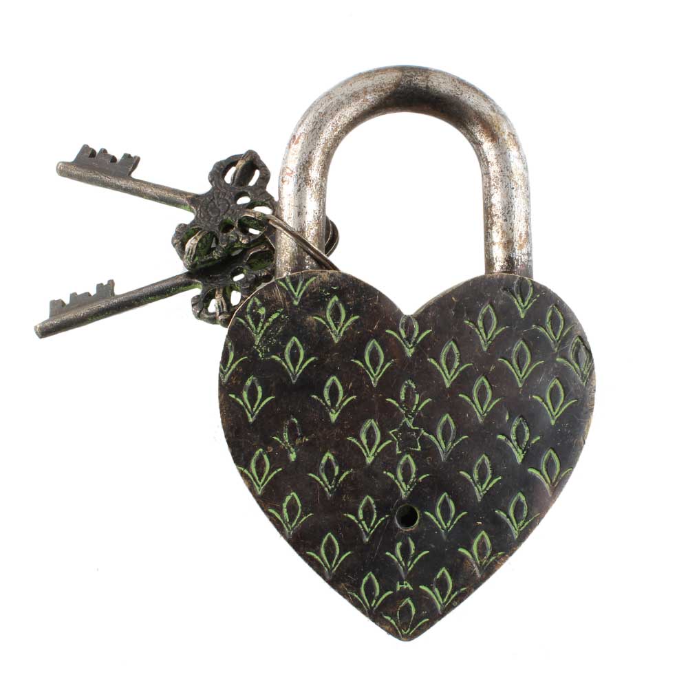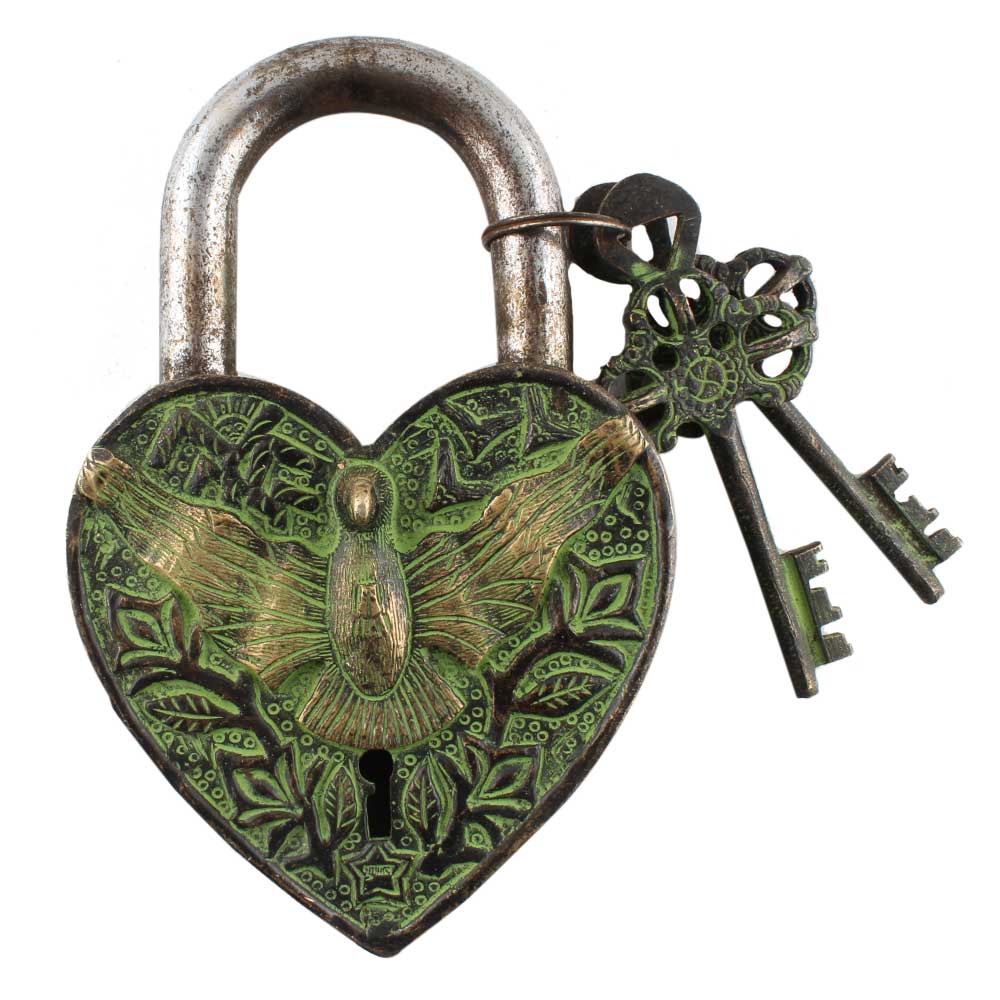 Brass Heart Shaped Bird Engraved Lock With Keys In Pair In Patina Finish add glamour and style to your home, office, school It is a fully functional door lock. Wedding Gift, New year gift, Birthday gift, corporate gift. The beautiful embellishments on the lock and keys makes them a perfect for gifting purposes.