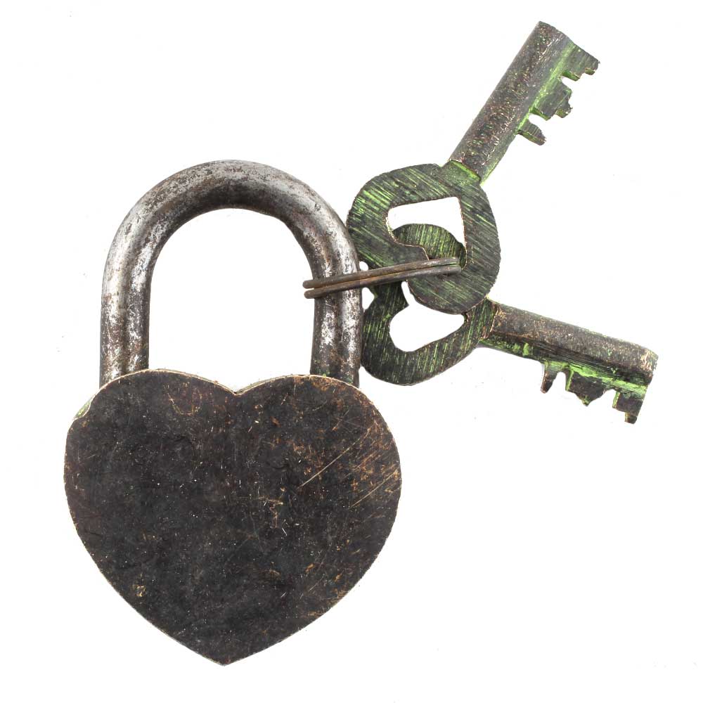 • Brass Heart Shaped Lock and Keys In Pair With Patina