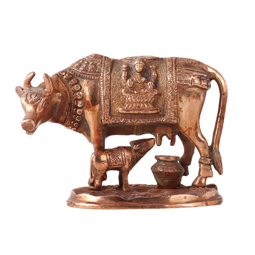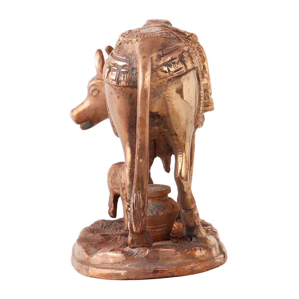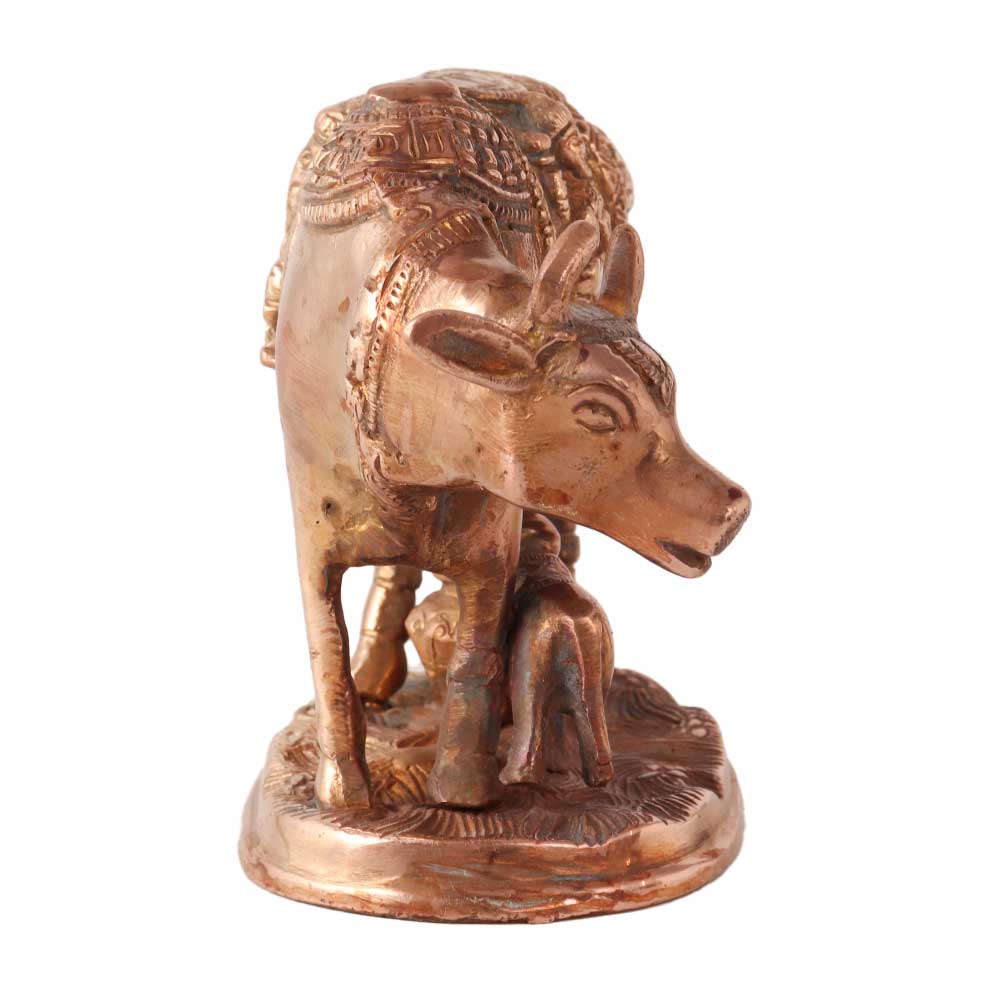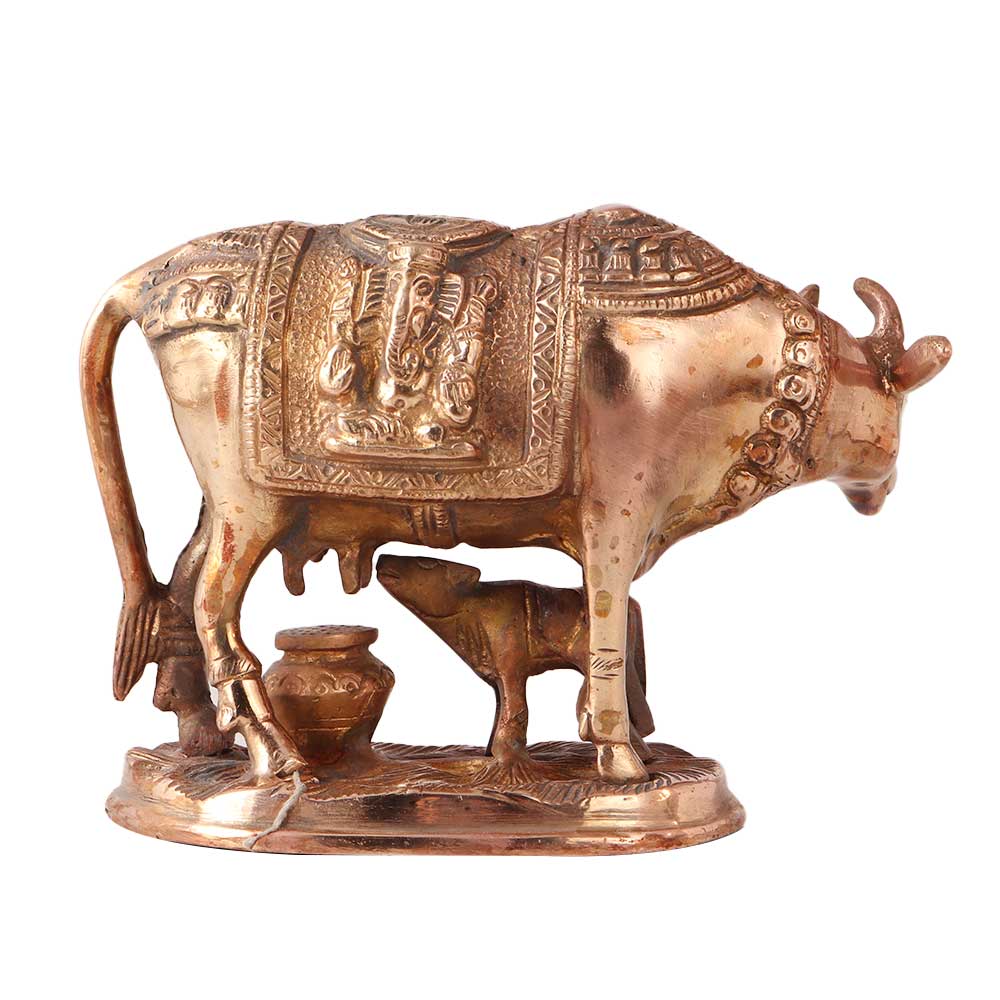 A variant of the Kamadhenu statue that shows the mother cow and her calf is a brass Kamadhenu statue. The calf contributes to the fertility and wealth that Kamadhenu symbolises in Hindu mythology as the progeny of Kamadhenu. In Hindu homes and temples, the brass Kamadhenu statue with a calf is frequently used for prayer or as beautiful furniture. The presence of this statue in a person's home is said to bestow blessings and good fortune on the family. The statue, which is frequently embellished with bright decorations, can be positioned on an altar or in a prominent spot in a space. According to Hindu mythology, Kamadhenu is a heavenly cow with the ability to grant any request or desire. She is related to wealth and abundance and is thought to be the mother of all cows. The calf's presence in the statue emphasises Kamadhenu's significance as a mother and nurturer. Devotees greatly appreciate the brass Kamadhenu statue with a calf as a wonderful depiction of this strong Hindu god.