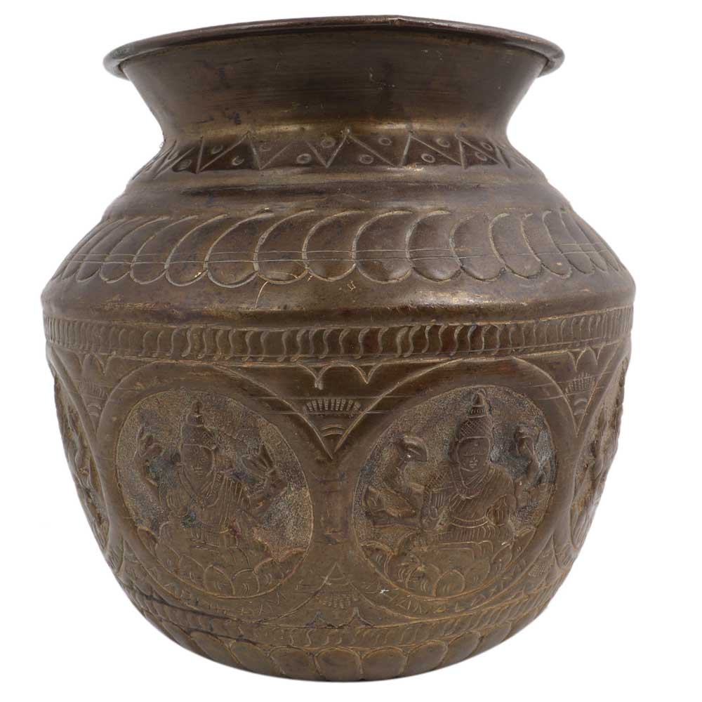 Brass Holy Water Pot Carved With God And Goddess And Traditional Design