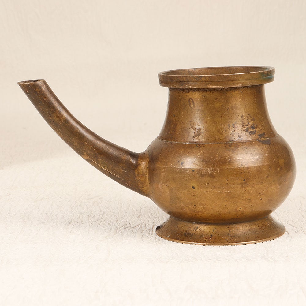 Add some sacred elegance to your home with this vintage brass holy water pot with a spout. This eye-catching pot features a timeless brown finish and sculpted spout perfect for dispensing holy water. This vintage pot is ideal for holding holy water used for blessings and purification rituals. The brass material and brown finish give it an aged, dignified appearance that looks great displayed in a home entryway, kitchen, or prayer space. If you appreciate sacred relics with old-world charm, this vintage holy water pot belongs in your home. Use it to add a touch of holiness and tradition to your daily spiritual practices.