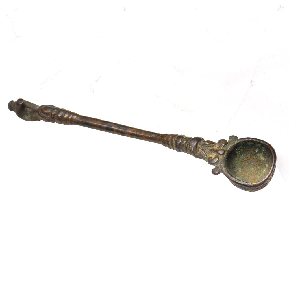 This is an intricately carved pooja spoon made of brass is used for offering worship during puja or havan . The spoon has a small bowl to fill holy water or oil with a decorative finial and an abstract design on the top and bottom of the spoon . Use it as a home décor product or as a gifting option for family and friends.