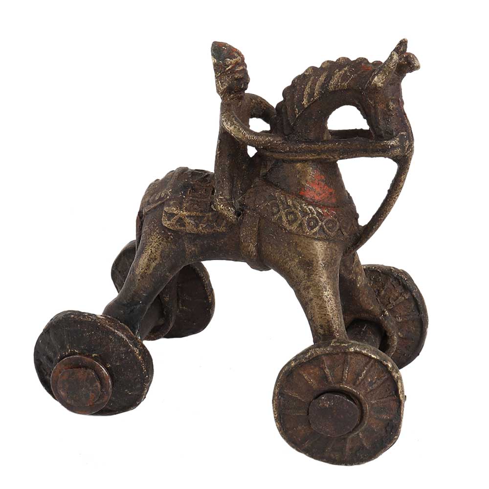 • Brass Horse and Rider on Wheels East Indian Temple Toy