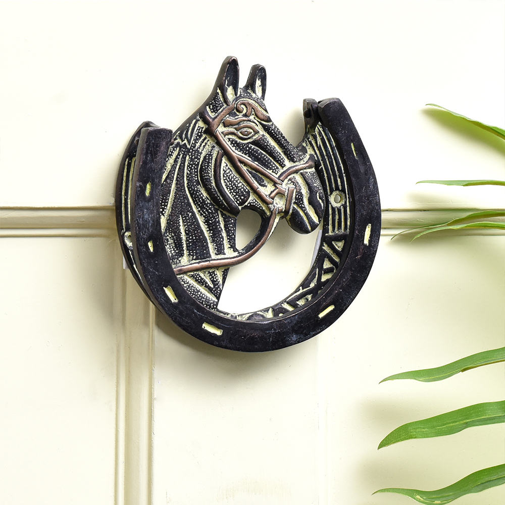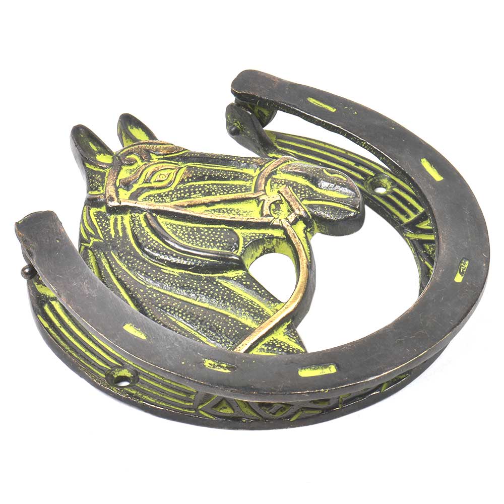 This beautifully handmade brass door Knocker has a horse face in between the horse shoe has a nice green patina. The horse shoe was considered very auspicious by the cowboys and they use to nail it on the barn door for good luck and prosperity. Hang it on your main door for good luck and success.