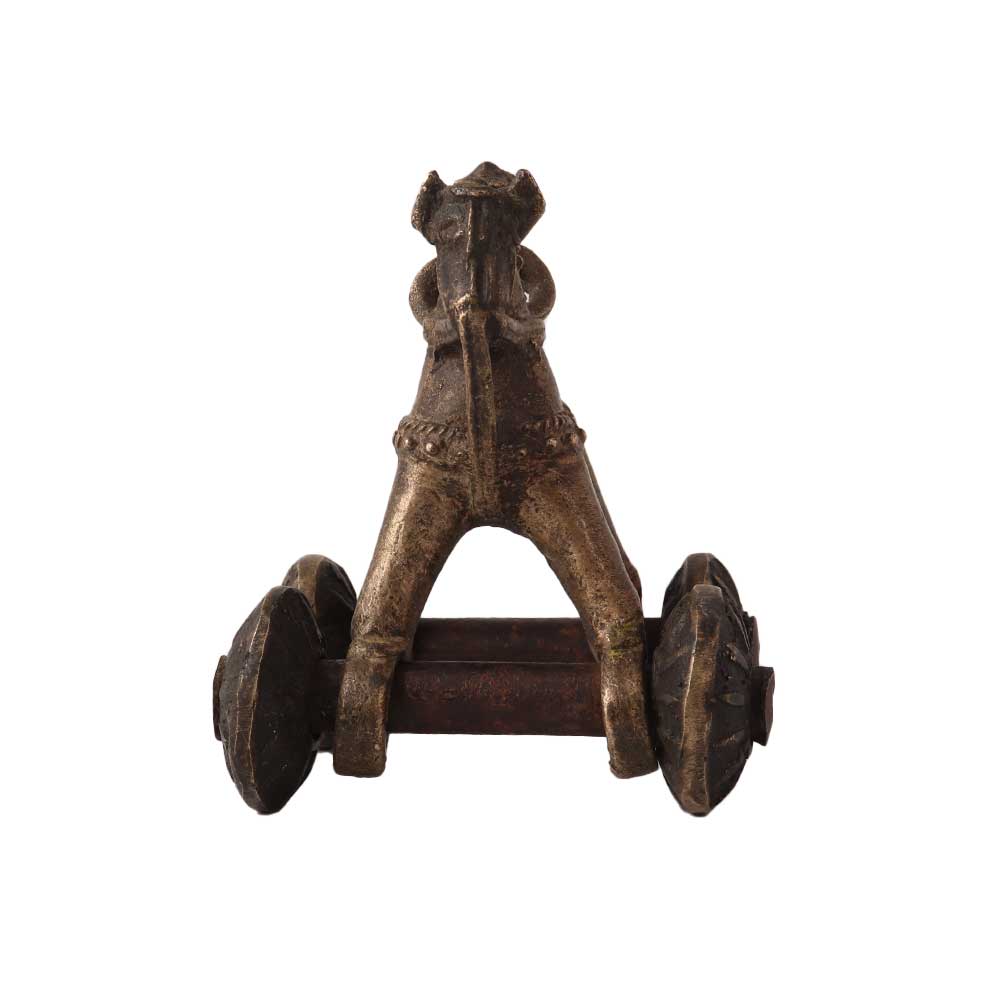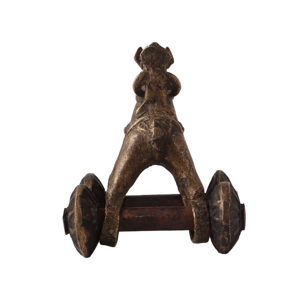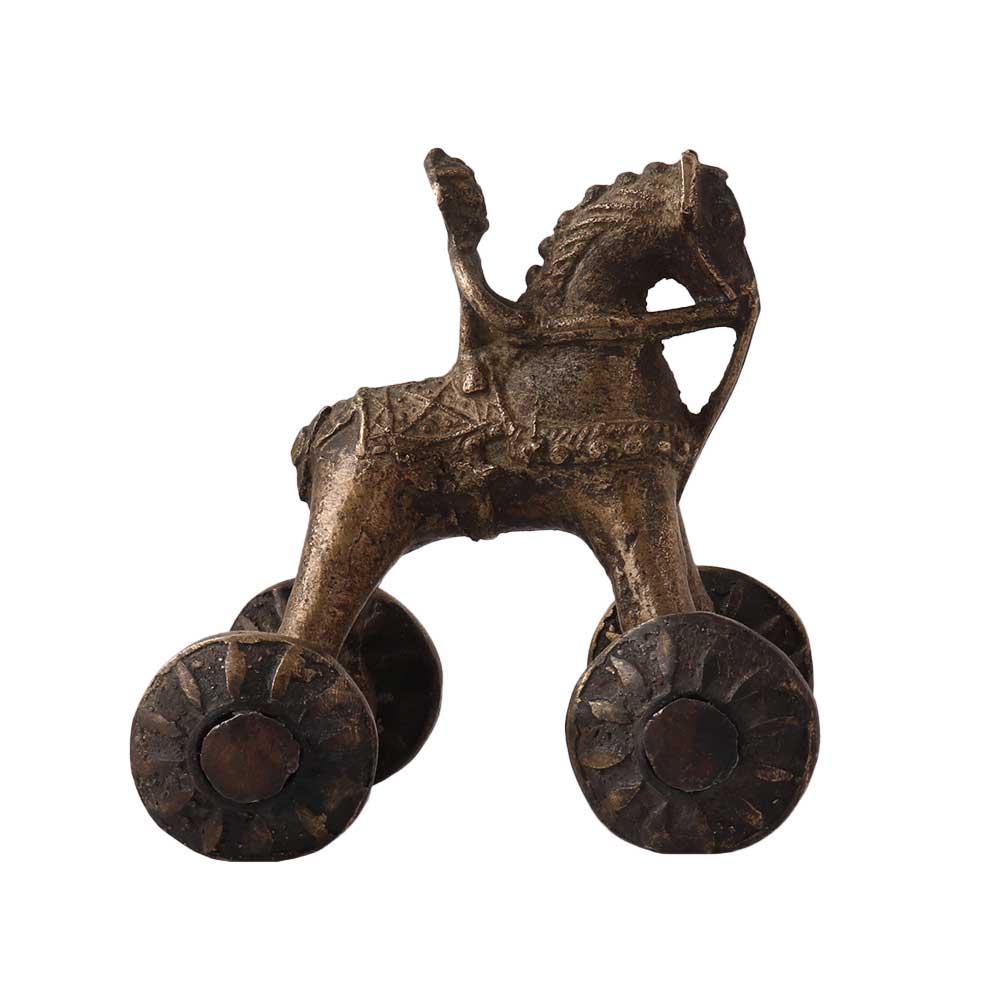A 19th century Indian brass horse temple toy with a rider is a unique and collectible item from India's rich cultural heritage. This type of brass temple toy was made in temple workshops during the 19th century and was used as a religious or decorative item. The brass kids toy features a rider sitting on top of a brass horse, which is intricately carved and decorated with traditional Indian designs. The use of brass material and intricate details of the rider's attire and horse's body demonstrate the high level of craftsmanship involved in making these toys. The use of vibrant colors and intricate carvings make these toys highly sought after by collectors and enthusiasts of Indian art and culture. This equestrian temple toy is not only a beautiful piece of artwork, but it also tells a story of India's rich cultural heritage and tradition. Overall, the 19th century Indian brass horse temple toy with a rider is a beautiful and functional piece that will bring joy to anyone who sees it.