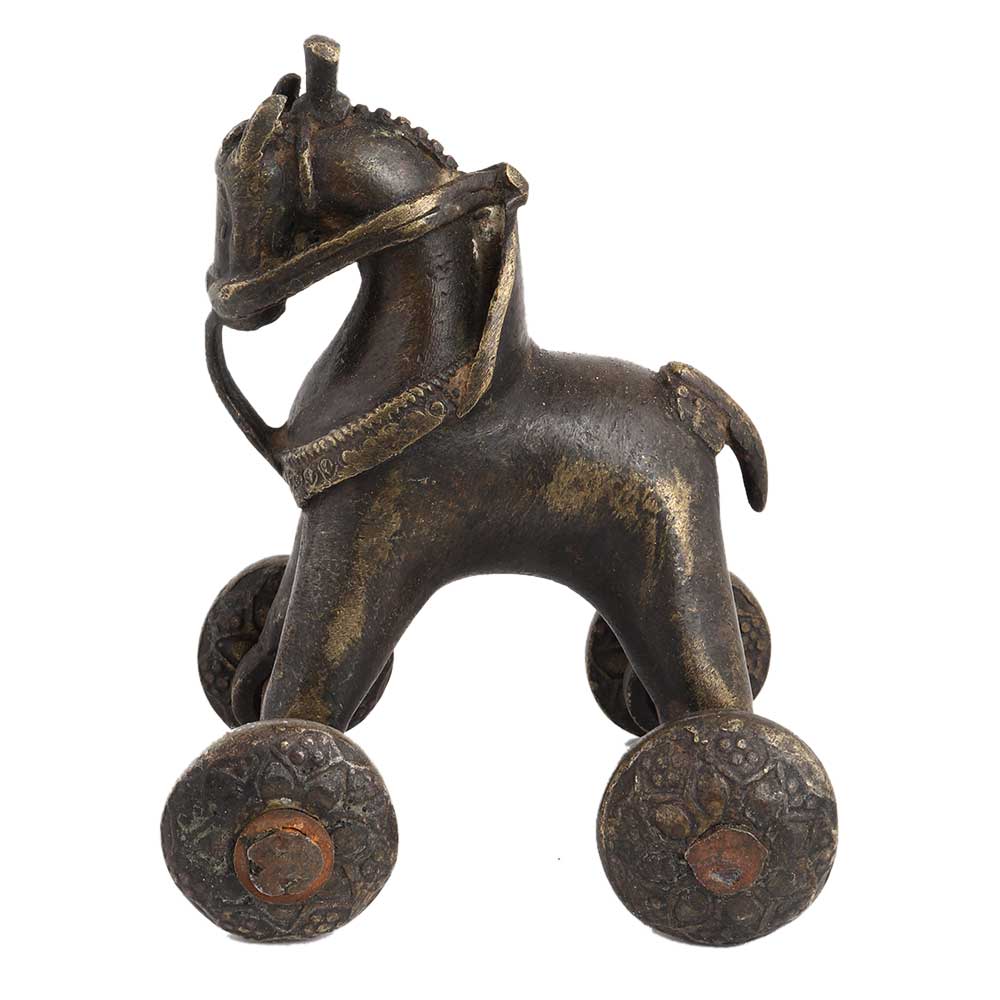 Brass Horse With Wheels Traditional Temple Toy Used to Occupy Children While Their Parents Were in Temple. The Originals Were Mostly Made of Bronze with Ornate Saddle. Wedding toy, birthday gift,anniversay gift, Home, School and hotel decoration, table display and a very interesting gift for your near and dear ones.