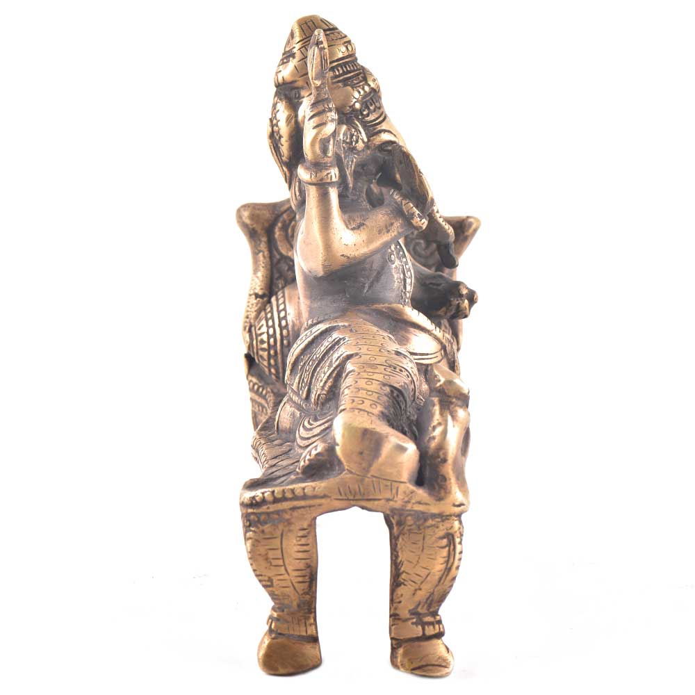 Beautiful and rare brass ganesha statue in a sitting and relaxed posture along with brass mooshak . Lord Ganesha brings good luck and prosperity when kept in the living room , pooja room or foyer area . It is also gifted to friends and relatives during auspicious occasions and functions.
