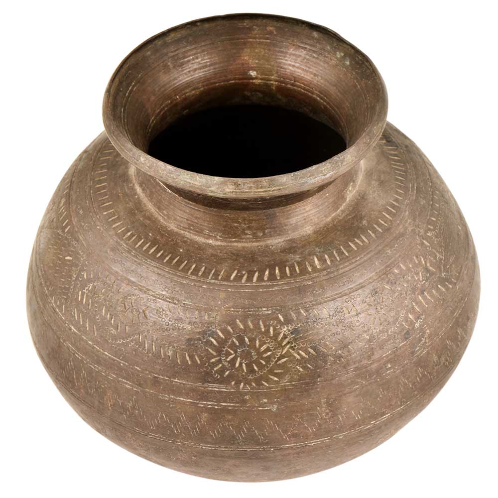 A lovely bronze floral engraved holy water pot that is slightly broad at the centre and narrow near the neck and bottom of the pot. This decorative old brass pot would make a lovely shelf ornament, flower pot or table display.