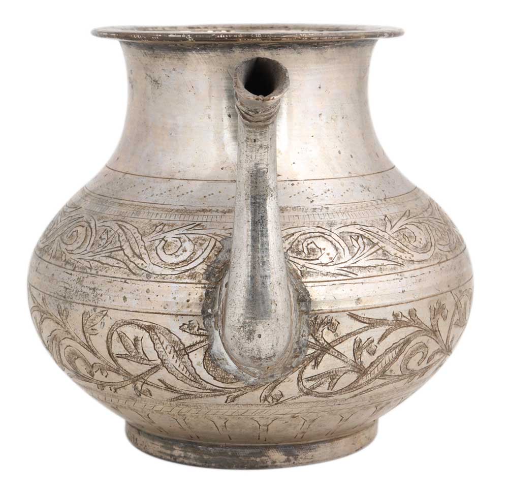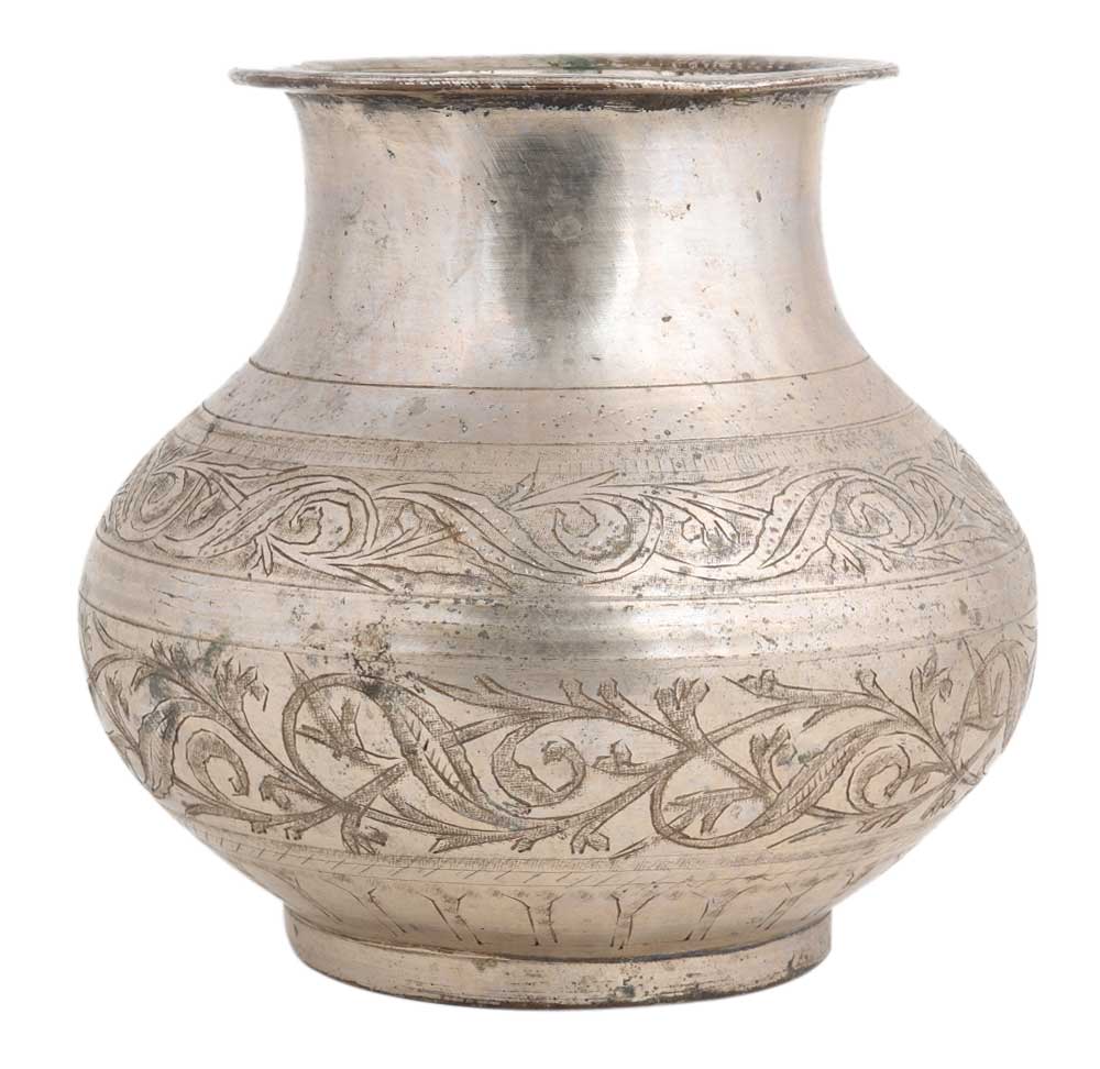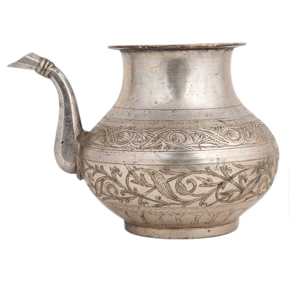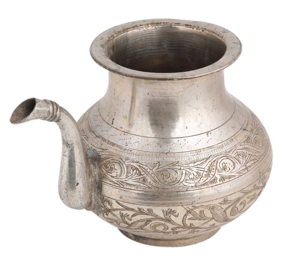 Brass Kamandal pot or holy water pot engraved with vines, flowers and leaves on the base of the pot. It has a spout which helps to pour out the liquid from the pot. It can also be used as a home decoration product, places of worship, wedding decoration or return gift during functions or corporate gift.
