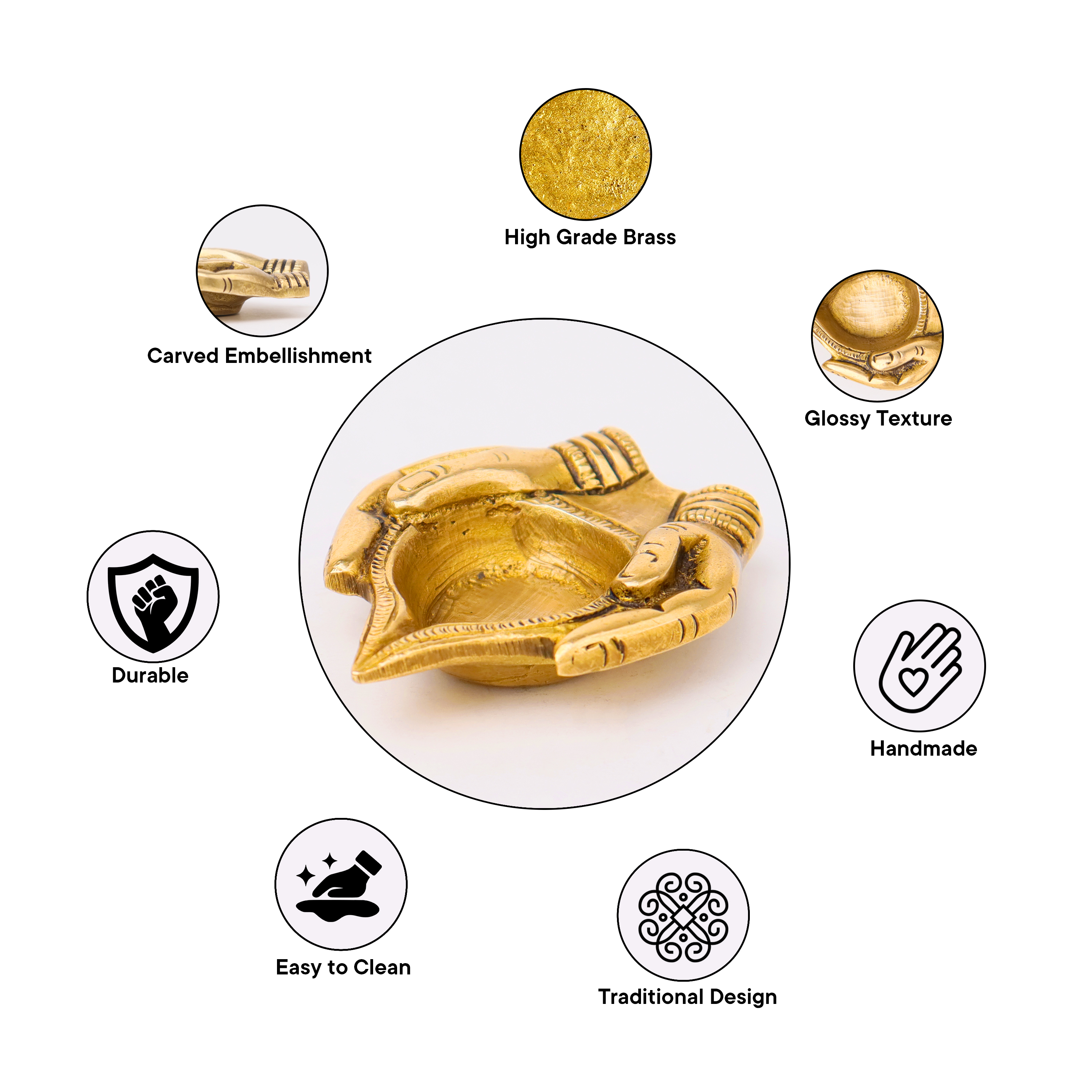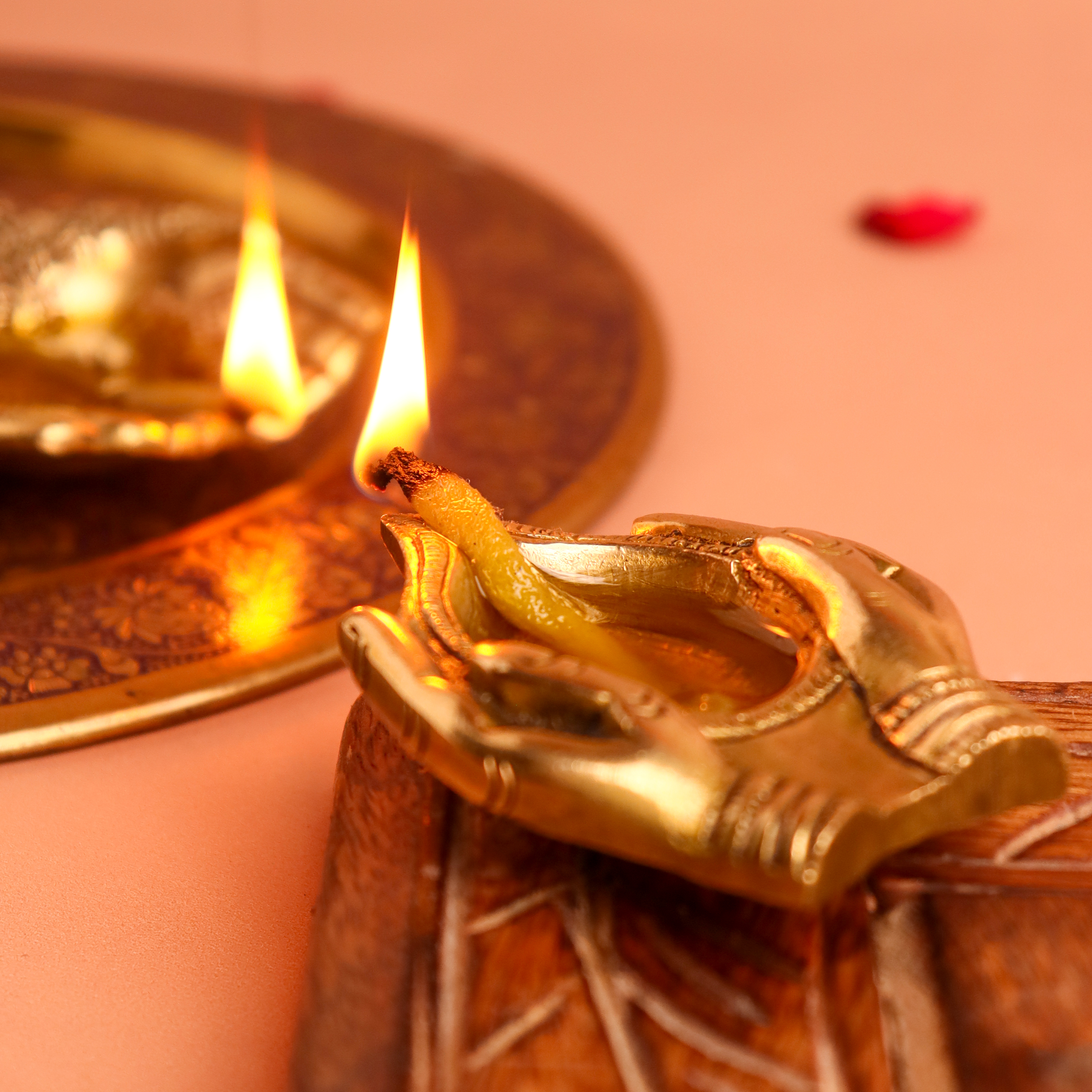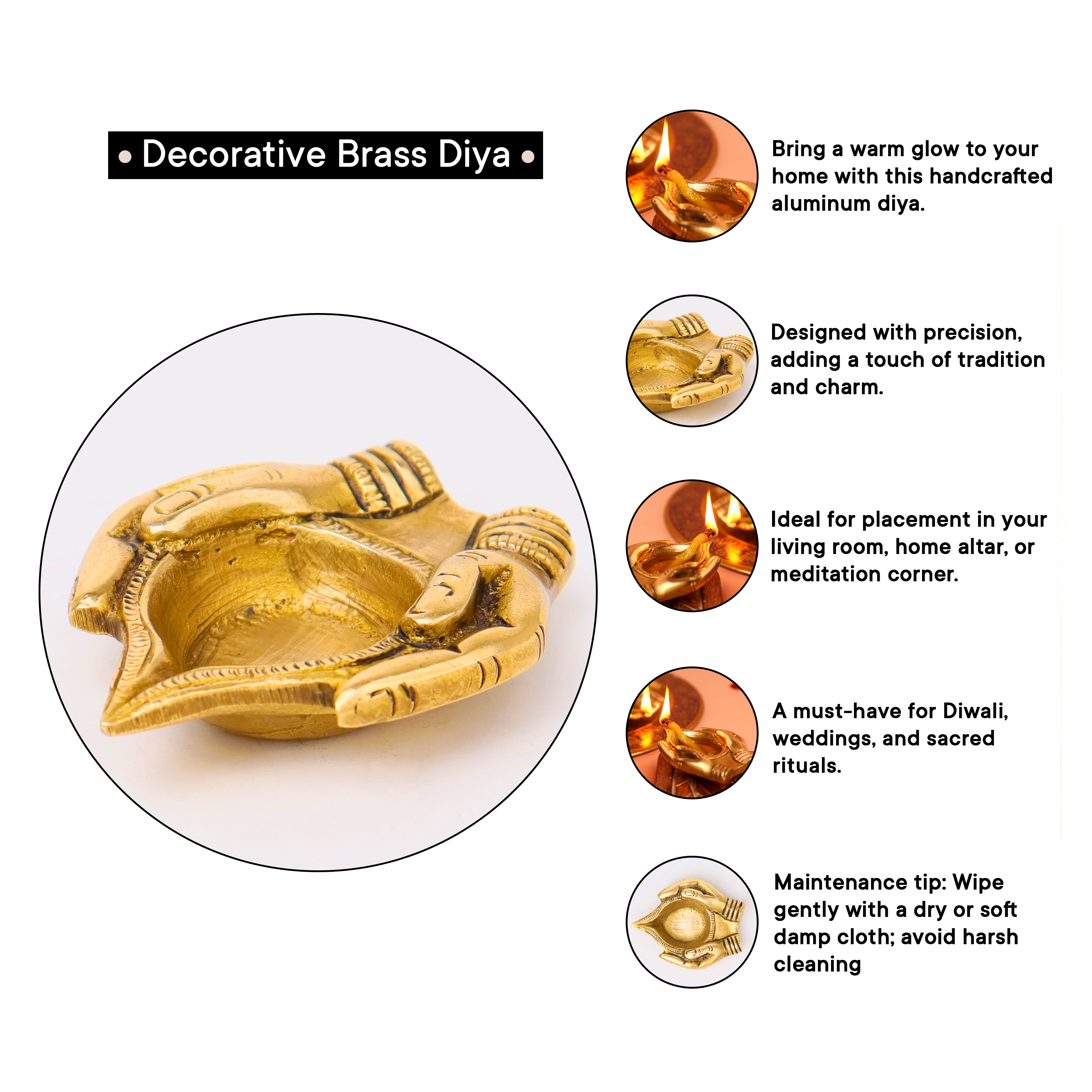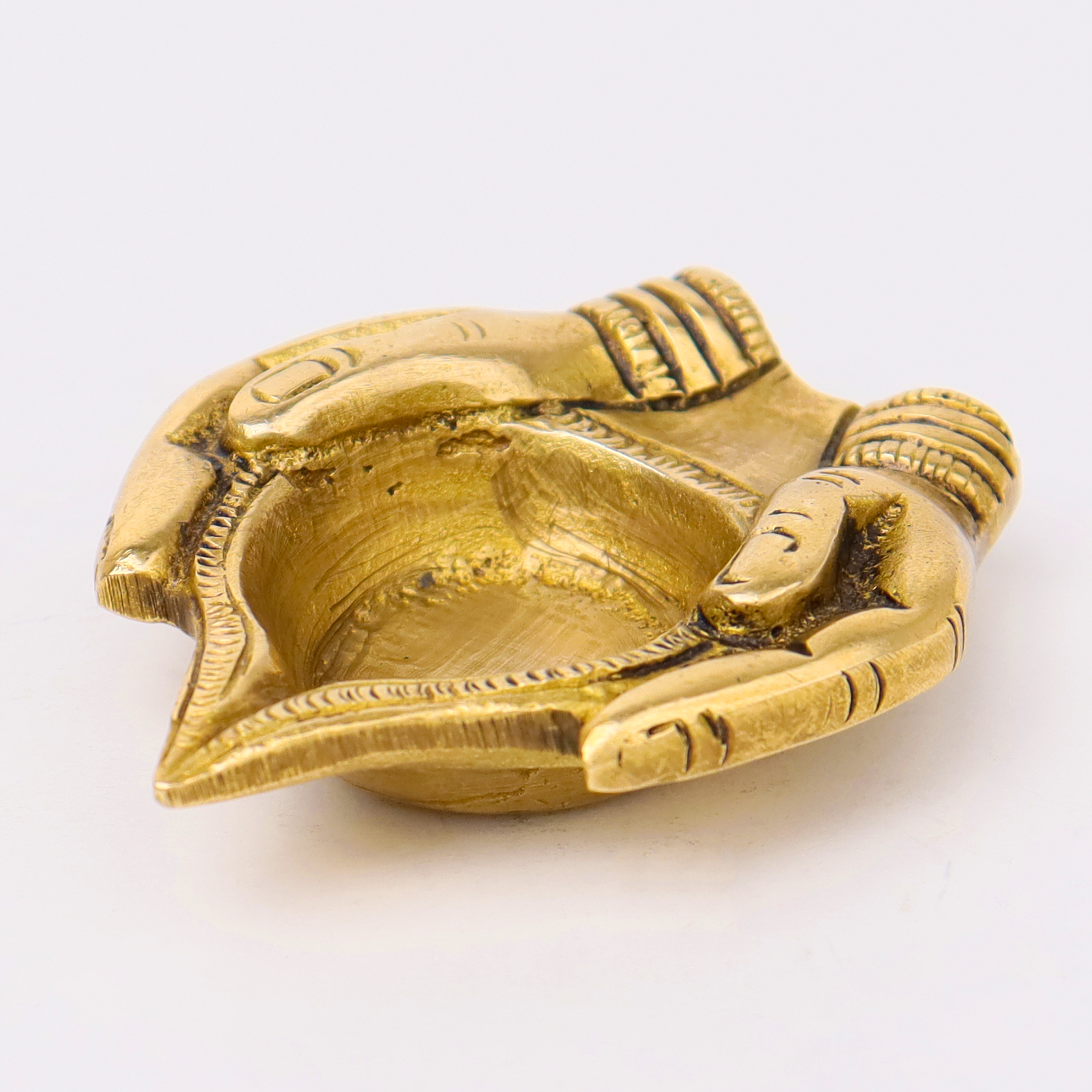 This elegant brass sculpture beautifully showcases a lady's hand gracefully holding an oil lamp (diya), adding an aura of sophistication and tradition to any setting. The fine craftsmanship captures the intricate details of the lady's hand and the diya, making it an exceptional piece of art that complements both contemporary and traditional interiors. The brass finish gives it a timeless appeal, perfect for use during festive occasions, spiritual rituals, or as a decorative accent.