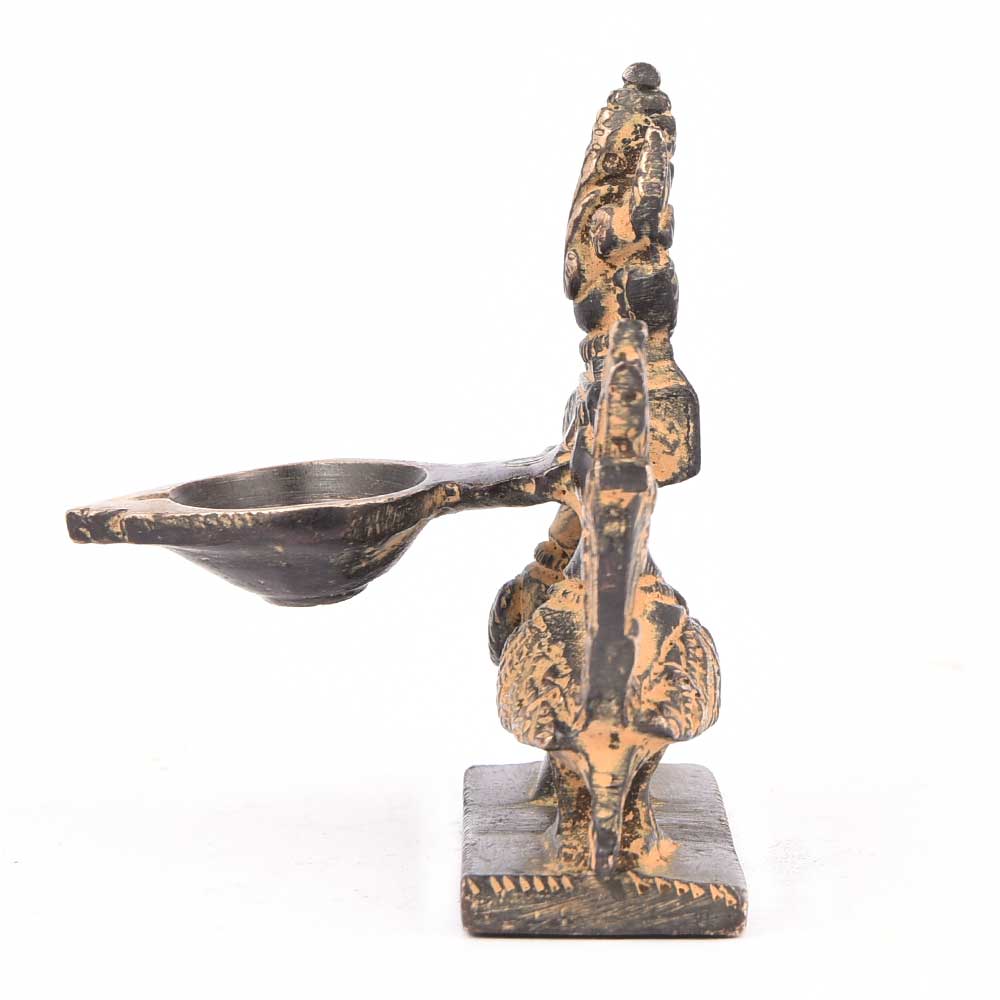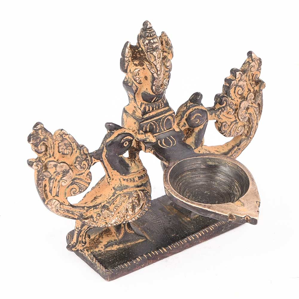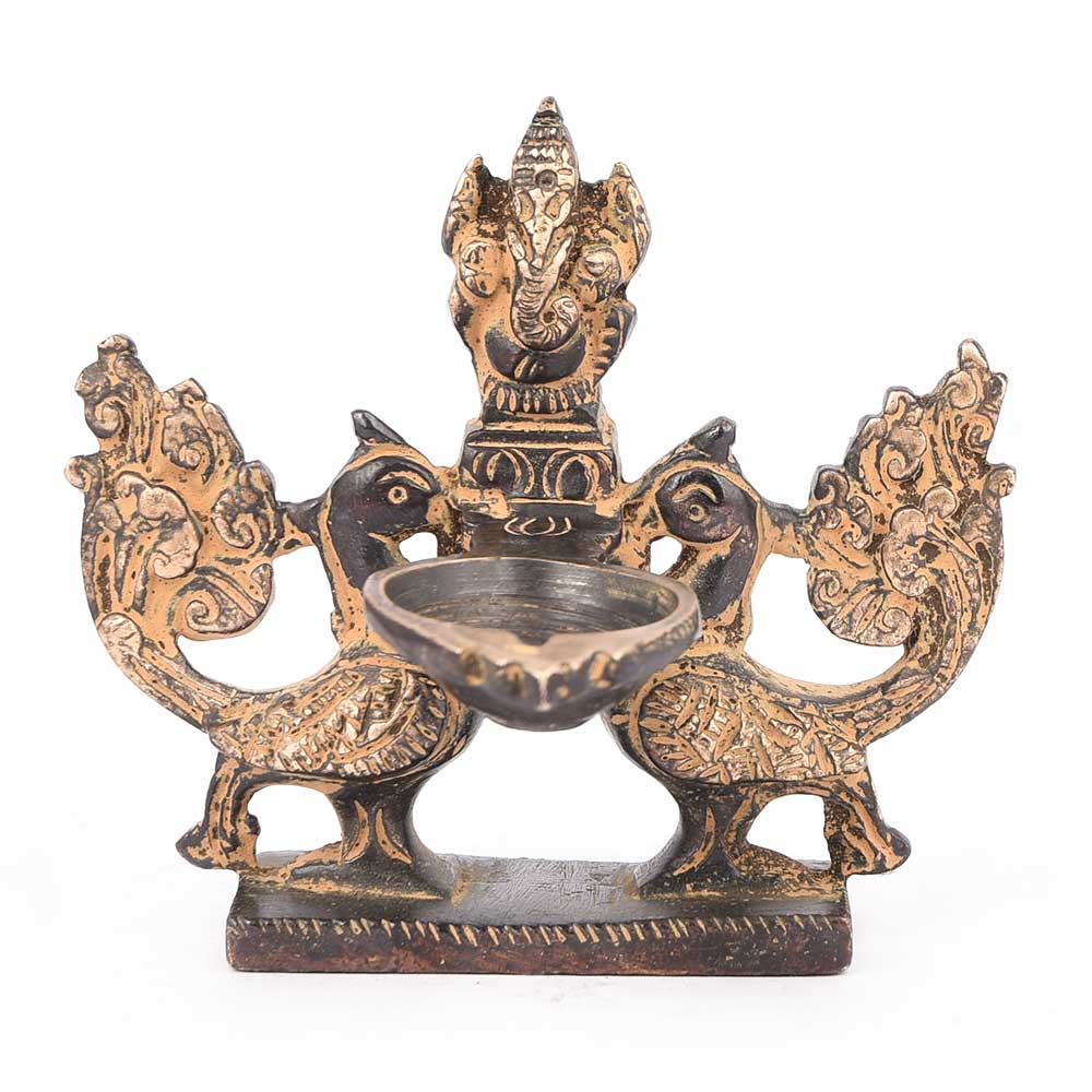 Heritage Brass Lamp of Two Peacock Holding Lord Ganesh At Center Made in Ethnic Brass Patinated in Red. This Oil Lamp An Ideal Decoration During Diwali and Other Religious Occasions.