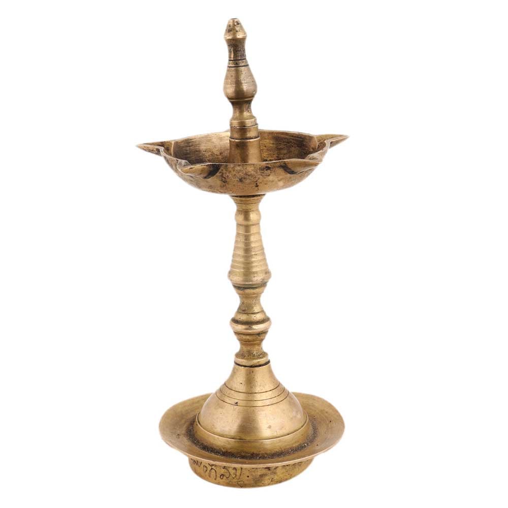 This brass pancha mukhi or five lamp Kuthu Vilakku oil lamp. The same is known to bring peace and prosperity to your household when lighted. Since the brass lampstand features an awe-inspiring design, it may become tarnished with patina. However, it is easy to clean these brass products with metal polish to attain a clean and tidy look. Place this in your pooja room, and it will delight all during evening prayers.