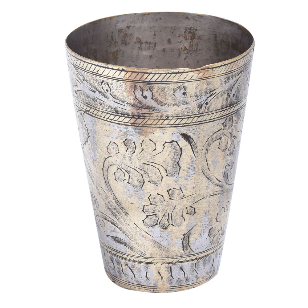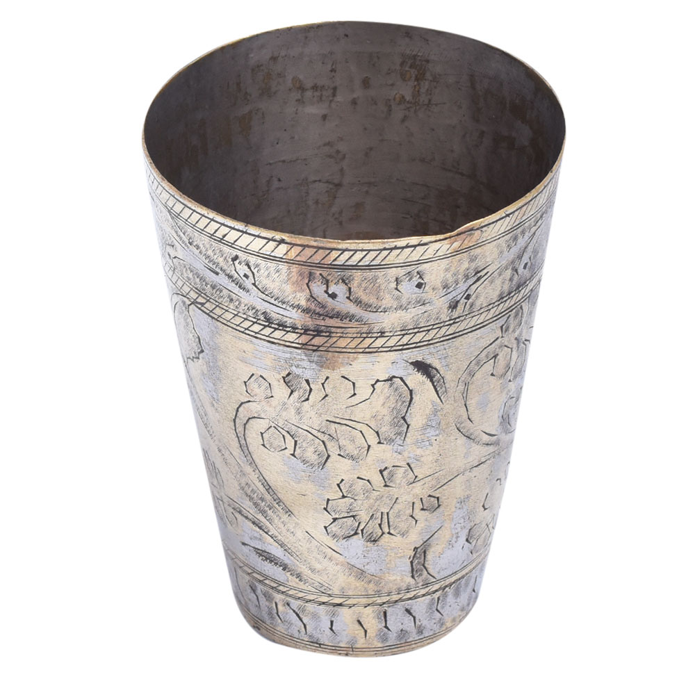 Engraved flower and long leaves on a brass lassi glass cup makes the glass look very indian and traditional. This is a traditional lassi glass with dotted border and leaves design that is made by expert craftsmen in the northern region. It is strong and sturdy, and it works well as a table display, vase, or pen and pencil stand. Lovely gift for an anniversary, wedding, or birthday, and a true collector's item.