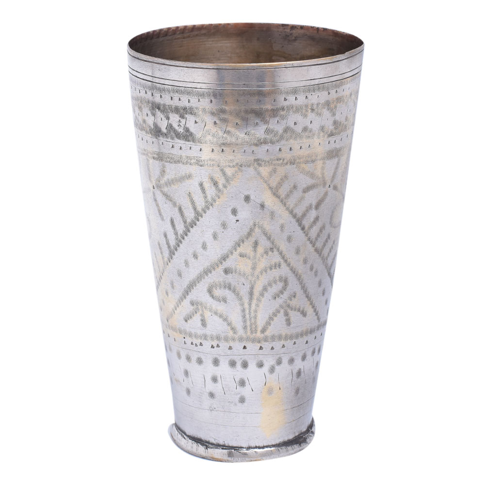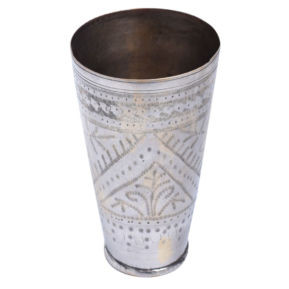 This is a lovely old Indian lassi cup with geometric leafy pattern is made of brass base, and engraved by hand. These make lovely little vases or are ideal for storing pens or paint brushes. Perfect for vintage lovers and true collectors. Ideal for collection, home decoration, and personal gifting. Very nice decorative shape and collectible item in excellent condition.