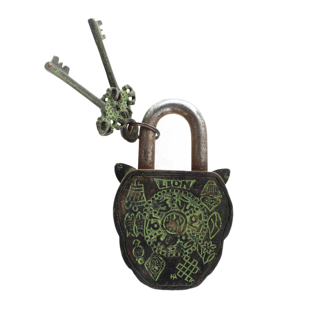 Brass Lion Shape Lock with Keys In Patina Finish with its remarkable patina finish makes it an exclusive decorative product to add an antique look to your home, office, school ,hotels, gym, clubs, restaurant doors. Wedding gift, birthday gift souvenir.
