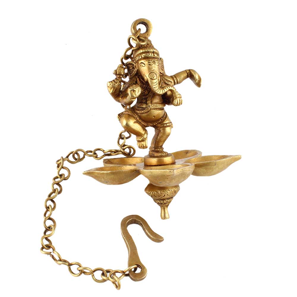 Brass Lord Ganesha with four wicks Hanging Lamp Or Diya to Decorate Your Homes, Offices, Temples Part of any religious or cultural gathering. Diwali gift, wedding gift for your near and dear ones.