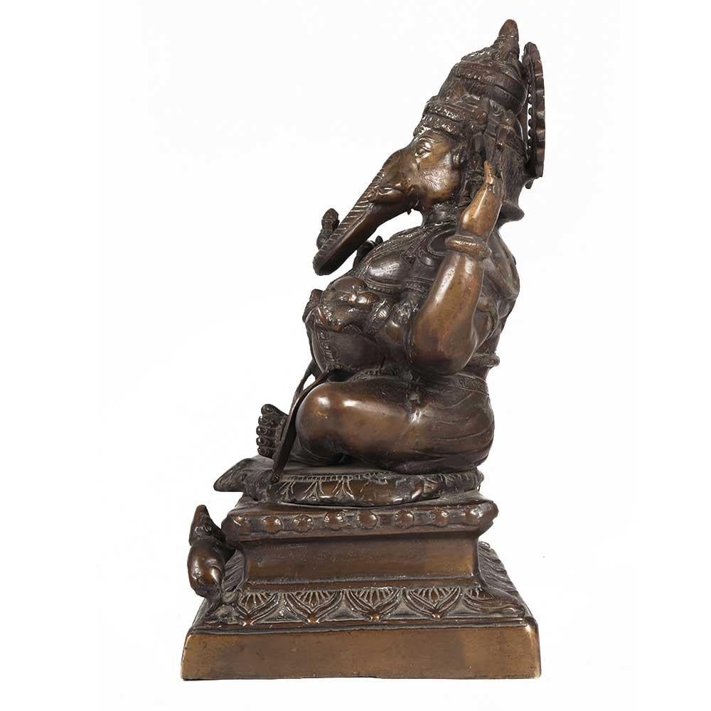 Ganesh sits atop a throne. He has four arms, each holding a noose, an axe, a pile of sweets, and his broken tusk, with his right held up in the protective abhaya mudra. Mooshika, Ganesh's vahana or vehicle, is sitting by Ganesha's feet. Rats are the ideal companion to Ganesh, "the remover of hurdles," since rats are capable of overcoming any impediment that stands in their way, much as Ganesh removes any obstacles from your spiritual path. He's dressed in a loose-fitting dhoti, with a necklace dangling from his enormous tummy.