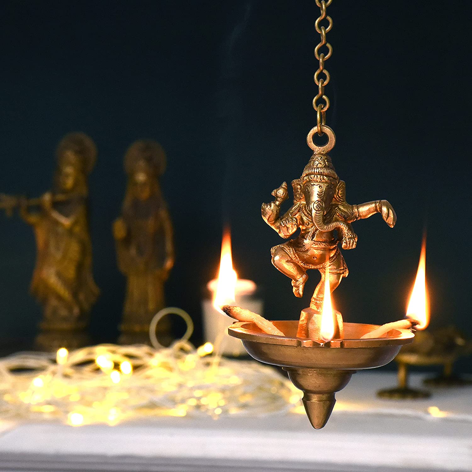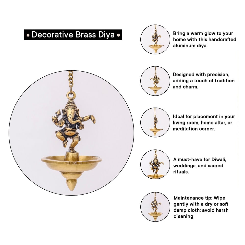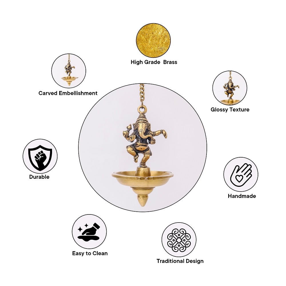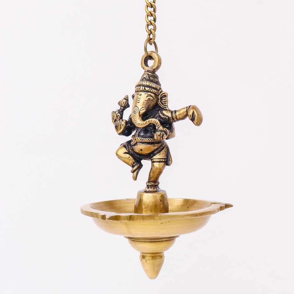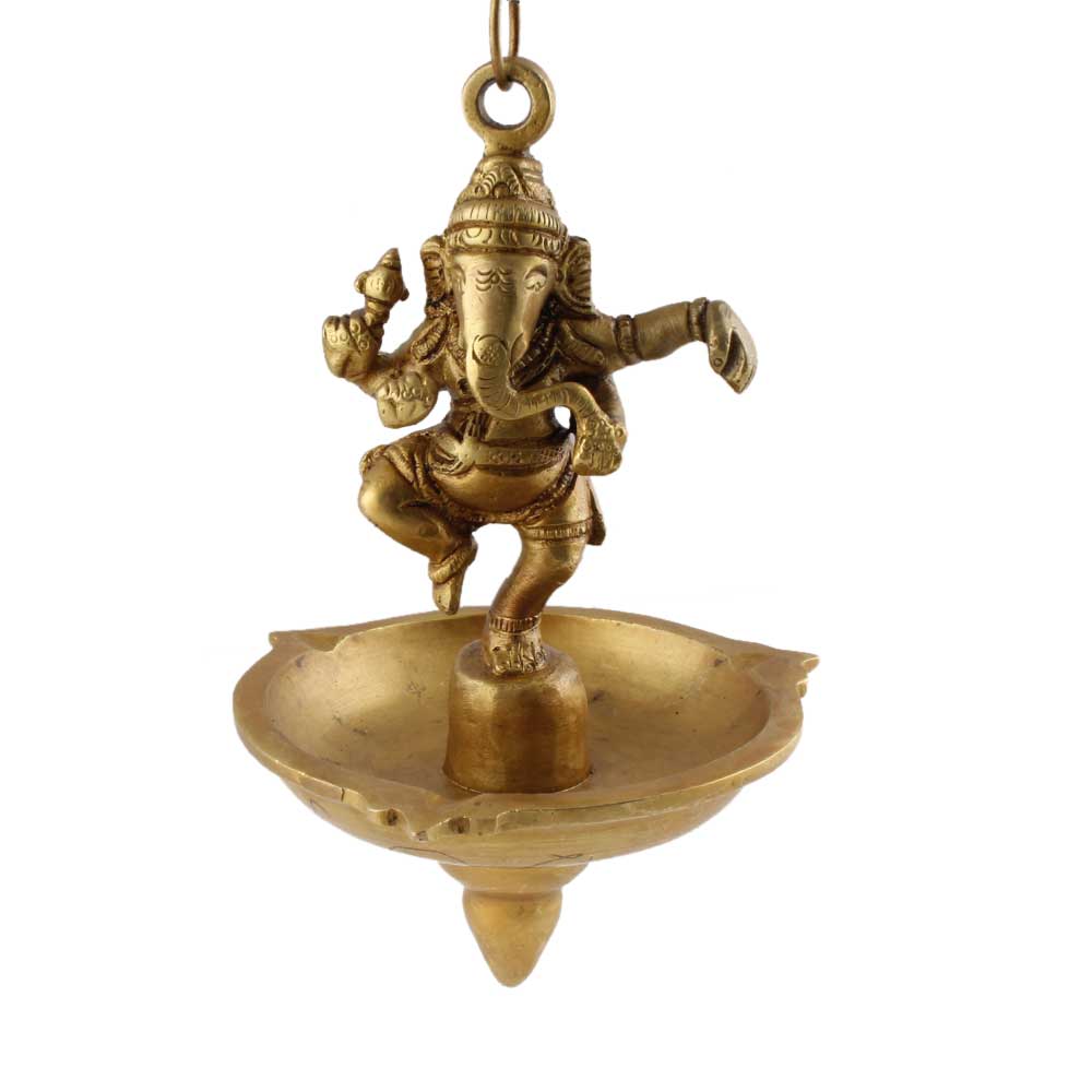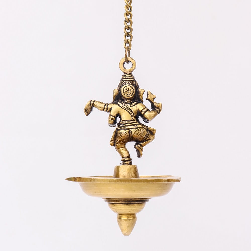 Decorate Your Homes, Offices, Temples with this magnificent brass Dancing Ganesha with hanging lamp Or diya with a lovely chain with a hook. Part of any religious or cultural gathering. Gift for your near and dear ones.