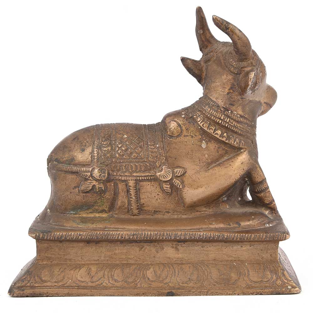 Bull has Symbolic Status in Hinduism and is a Vehicle for Shiva. Body Contours of the Bull Have Been Very Artistically Presented in This Sculpture. Carving Designs on All Sides Make This a Good Three-Dimensional Decor Piece.