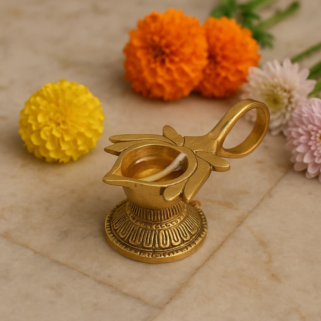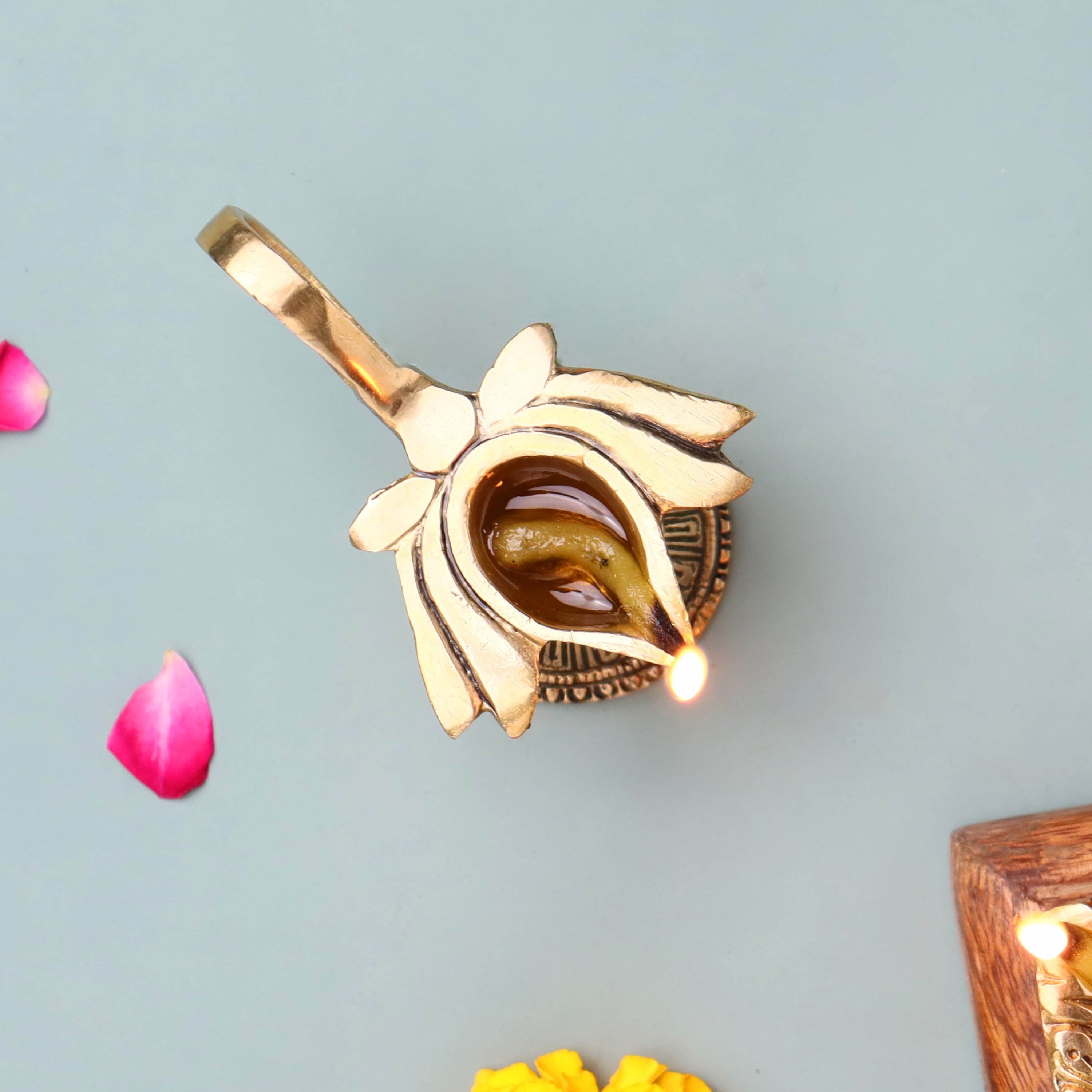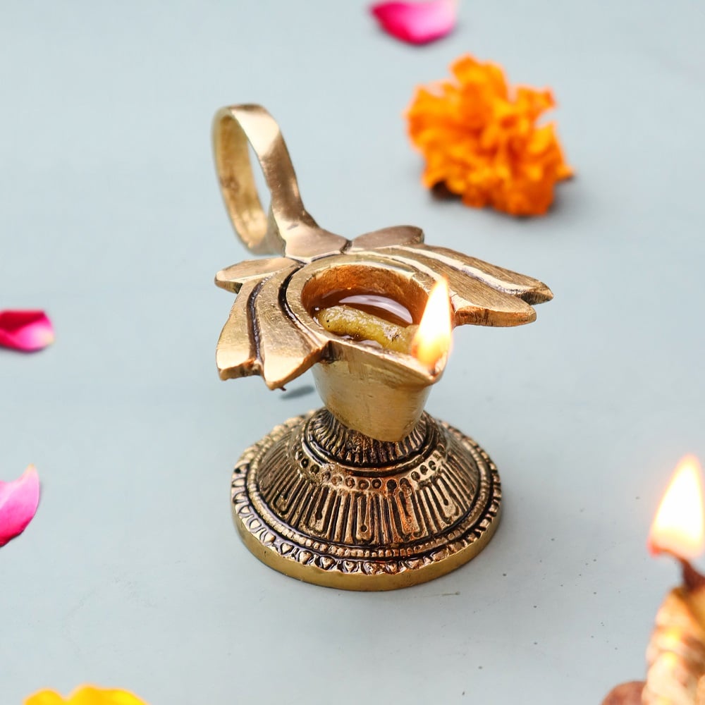 Light up your sacred spaces with the Brass Lotus Shape Oil Lamp on Stand with Handle, a handcrafted diya that beautifully combines devotion and artistry. Designed in the graceful form of a blooming lotus, this diya reflects purity and spiritual awakening. The sturdy brass stand ensures stability, while the easy-to-hold handle makes it functional and traditional at the same time. With its golden polish and intricate detailing, it’s an elegant centerpiece for daily puja rituals and festive celebrations.