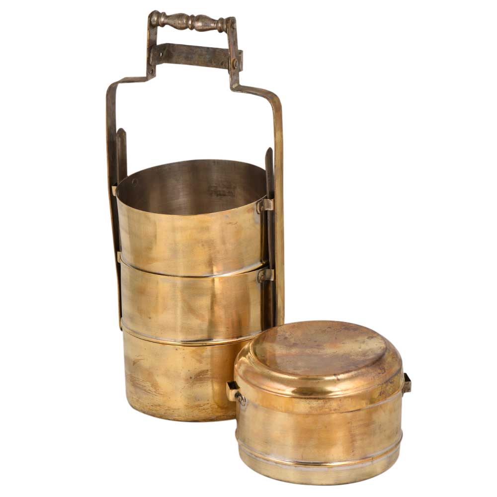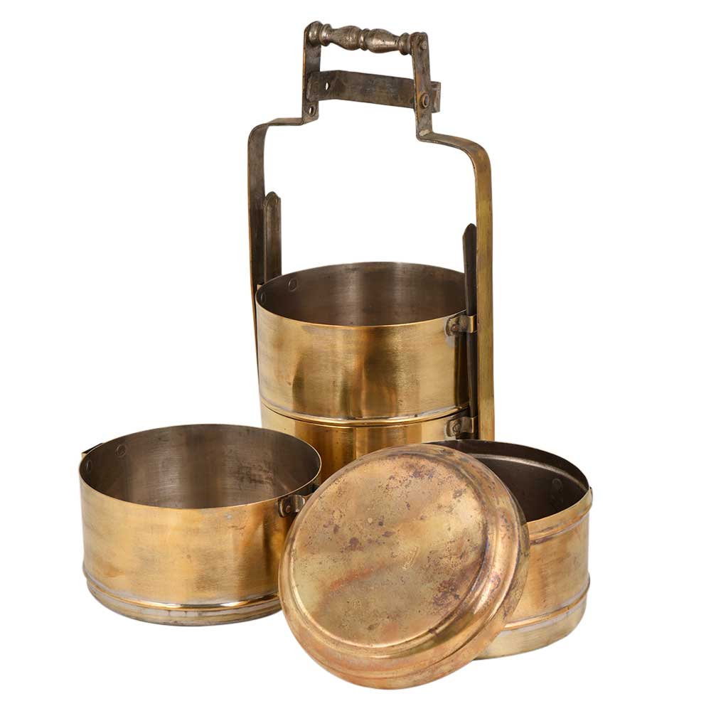 Brass Tiffin Box wit Four containers and a thick metal frame with lock. The lunch box has a lovely golden color with a lovely Handle with four containers that are very spacious and was used to transport food from one location to another . Use it as a showpiece, As a table decoration, as a flower pot or planter pot, for keeping your valuables safe and for presentation of food.