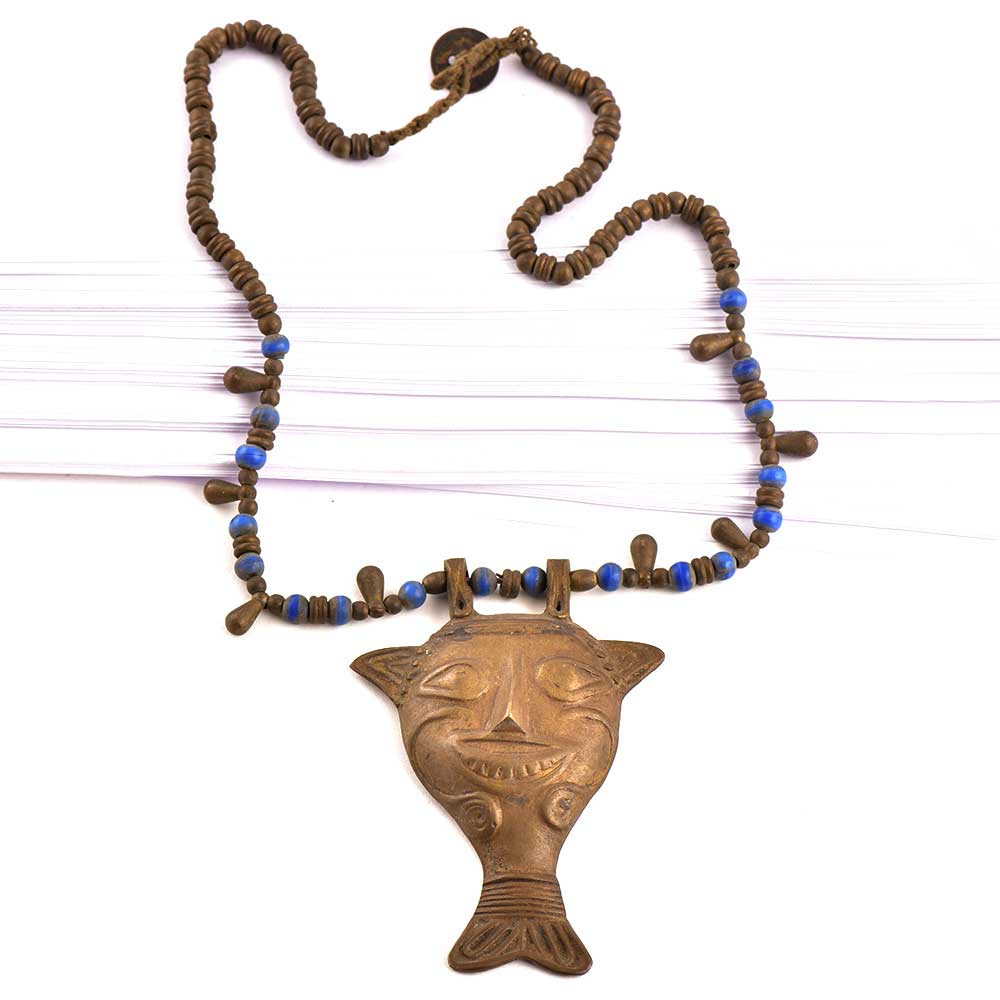 This Brass Mask Pendant on Brass Blue Bead Necklace beautifully unites tribal symbolism with contemporary artistic flair. Handcrafted from antique-finished brass, the pendant features a detailed mask motif — an ancient symbol of protection and spiritual strength — suspended on a strand of deep blue brass beads. The blend of metallic luster and serene blue tones creates a statement piece that embodies both power and grace, making it ideal for cultural styling or collectible décor.