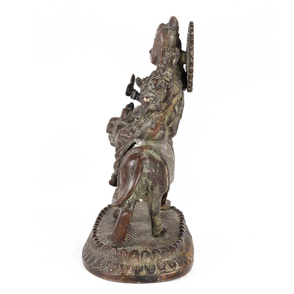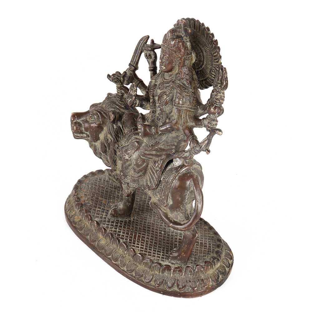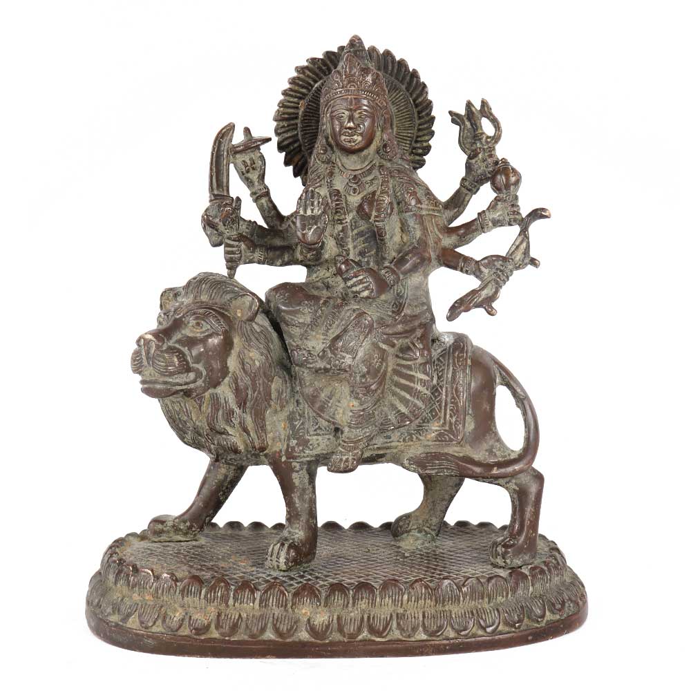 Durga is a manifestation of Devi, the Supremely Radiant Goddess, who is depicted with ten arms, riding a lion or a tiger, wielding weapons (including a Lotus Flower), smiling meditatively, and using Mudras, or Symbolic Hand Gestures.