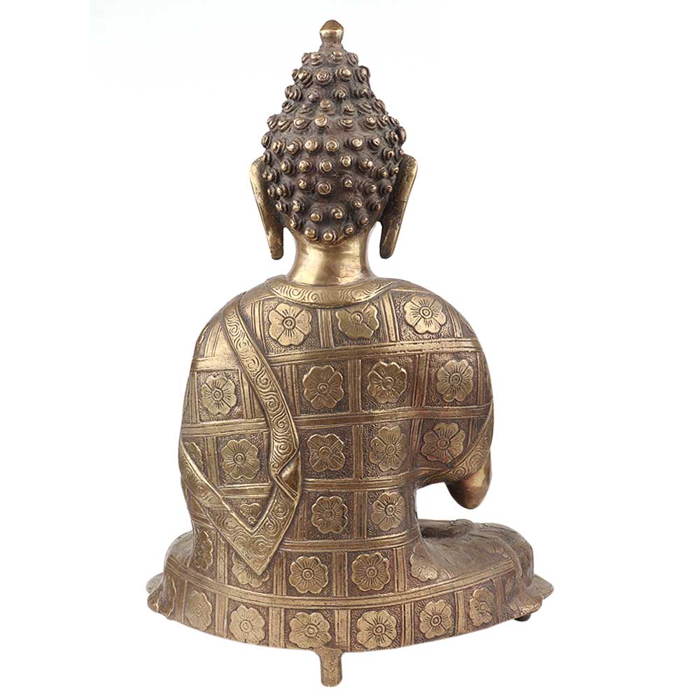 Buddha is sitting on a raised platform with eyes closed and hands in meditational position, this figurine is made of bronze and is handmade by the skilled craftsmen of India. This can be used for gifting, decoration, worshipping etc.