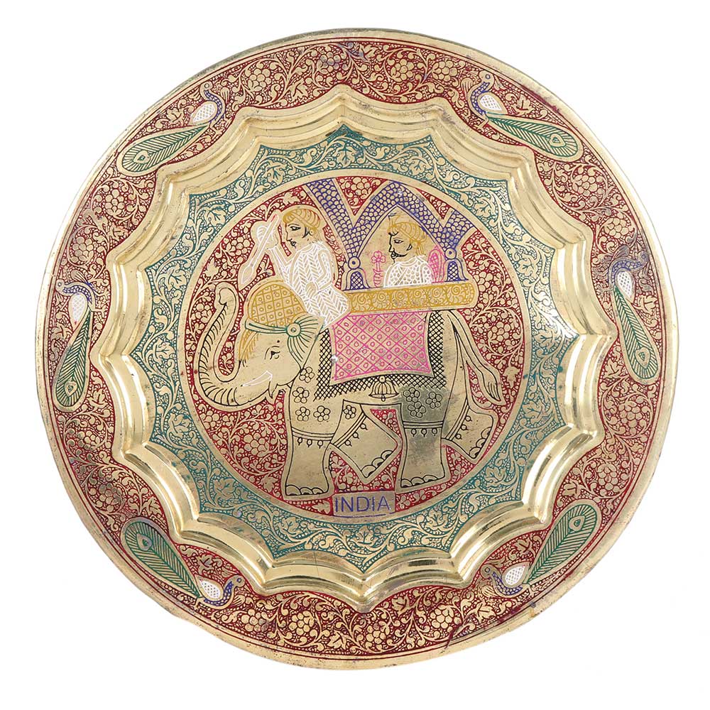 Brass wall plate with inlay work and enamel color for wall decoration. The plate features a wonderful elephant with king design in the centre and brilliant peacock decorations on the border. Get these gorgeous plates for your home decors and add spectacular beauty to your surroundings.