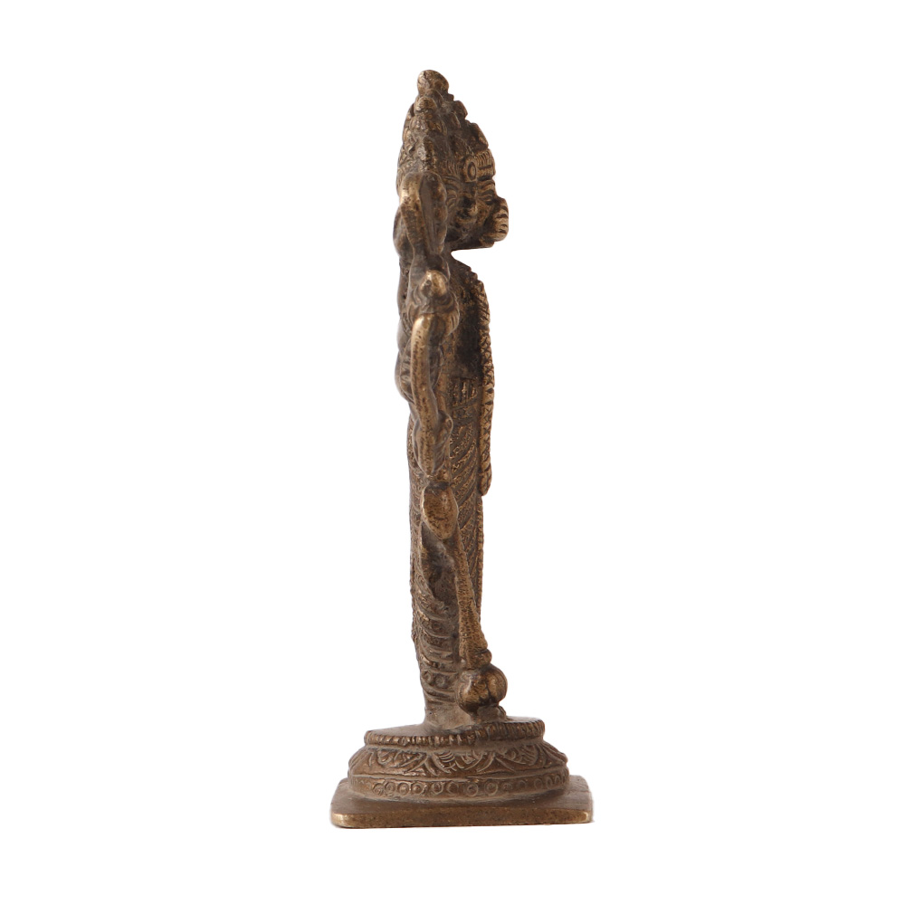 Lord Hanuman Hindu God Panchmukhi metal statue is a beautiful representation of the Hindu god Hanuman. In Hinduism, Hanuman is worshipped as a symbol of strength, devotion, and unwavering loyalty. The statue typically depicts Hanuman with five faces, hence the name "Panchmukhi" which means "five faces." Each face represents a different aspect of his divine nature and power. The statue is made of brass and features intricate details, making it a beautiful work of art statue decor. It is often placed in homes, temples, and places of worship as a symbol of protection and blessings. Devotees believe that displaying this statue in their homes will bring good fortune and success, and will protect them from harm. Overall, the brass Lord Hanuman Hindu God Panchmukhi statue is a indian figurine that symbolizes the god's strength, devotion, and power.