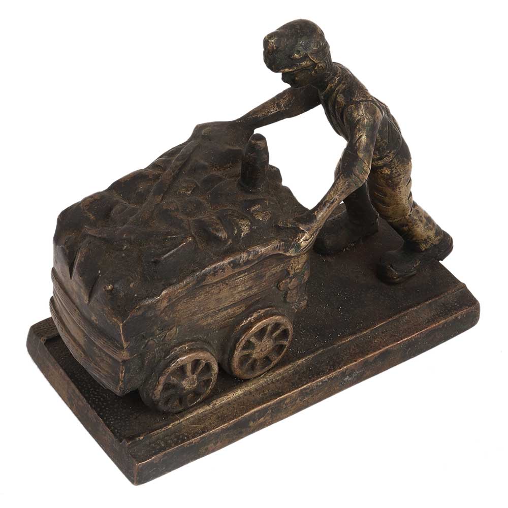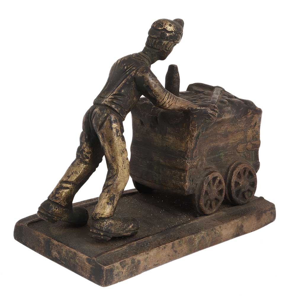 • Brass Miner Statue  Pushing Coal On Wooden Plinth