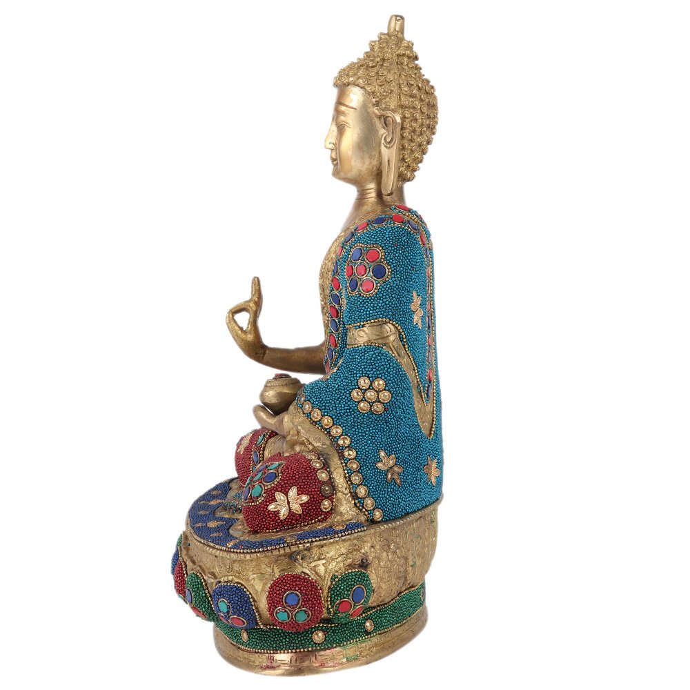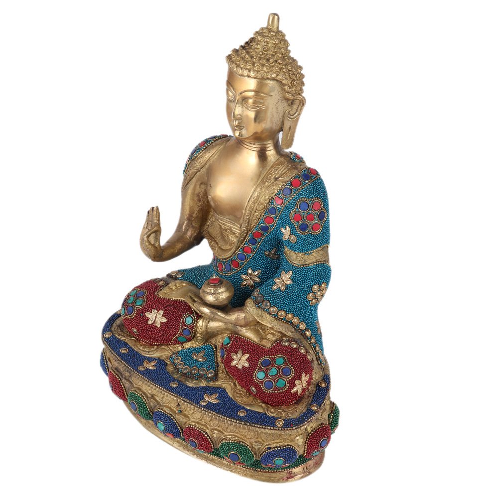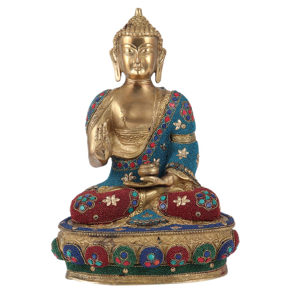 This is an exceptionally rare and auspicious Abhaya Buddha statue . This brass Statue decorated with multi colored stones is a popular religious lucky gift, thanksgiving gift, anniversary Gift, wedding gift, birthday gift and Diwali gift.