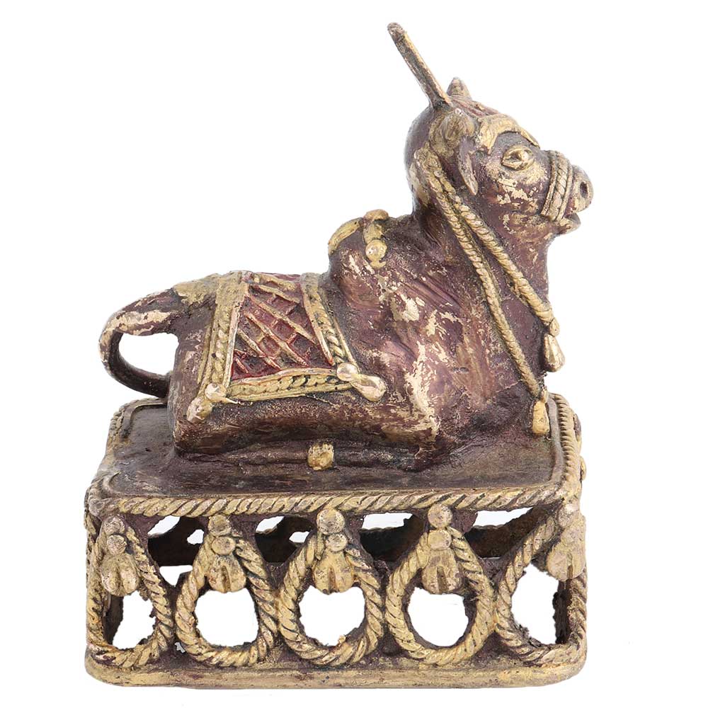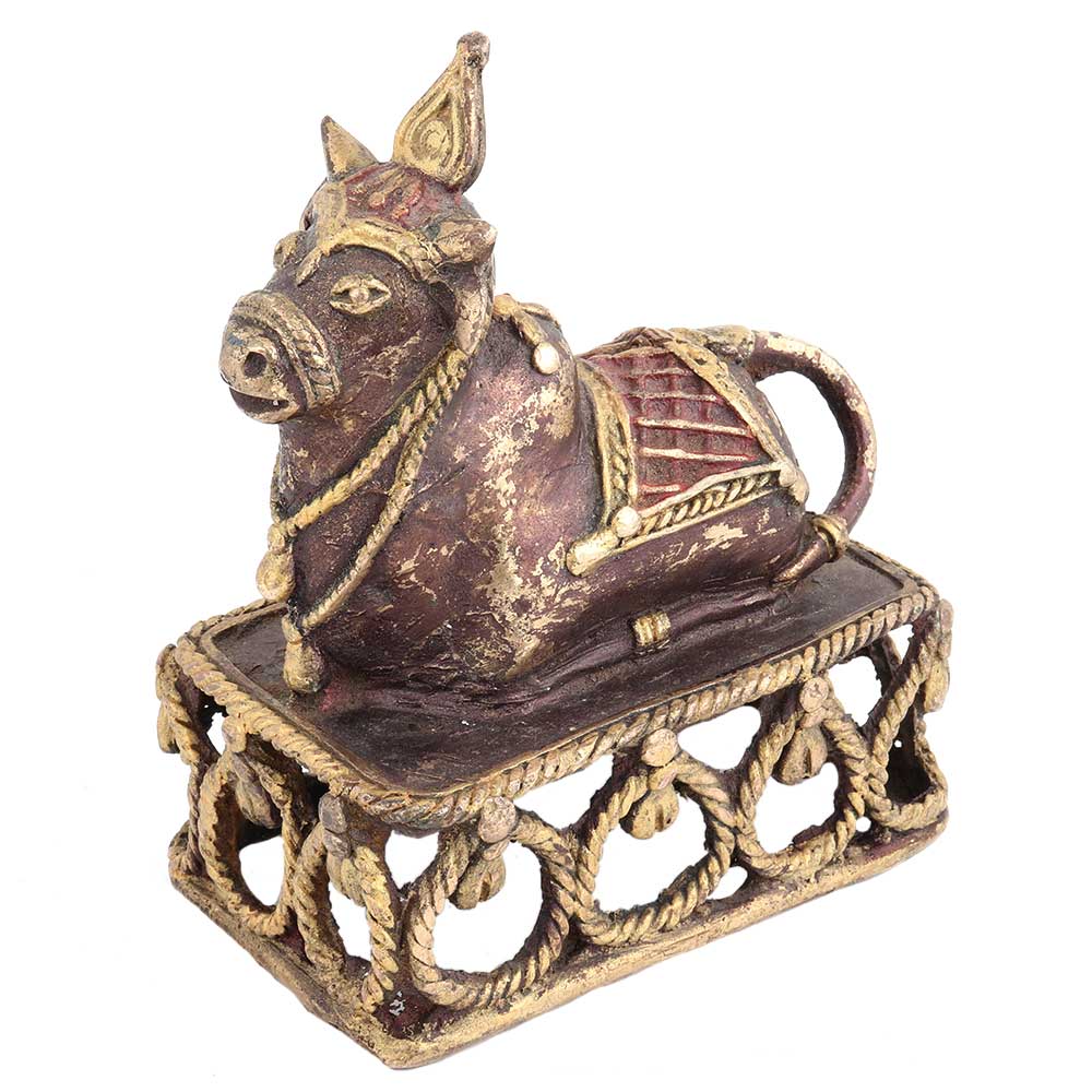 Brass Nandi Bull On Decorative Platform Showpiece is Perfect to Be Kept in Luxurious and Modern Drawing Rooms as a Symbol of Luck, Wealth and Prosperity. These Antiquated Looking Nandi Statues is Absolutely Ideal for Gift Purposes.