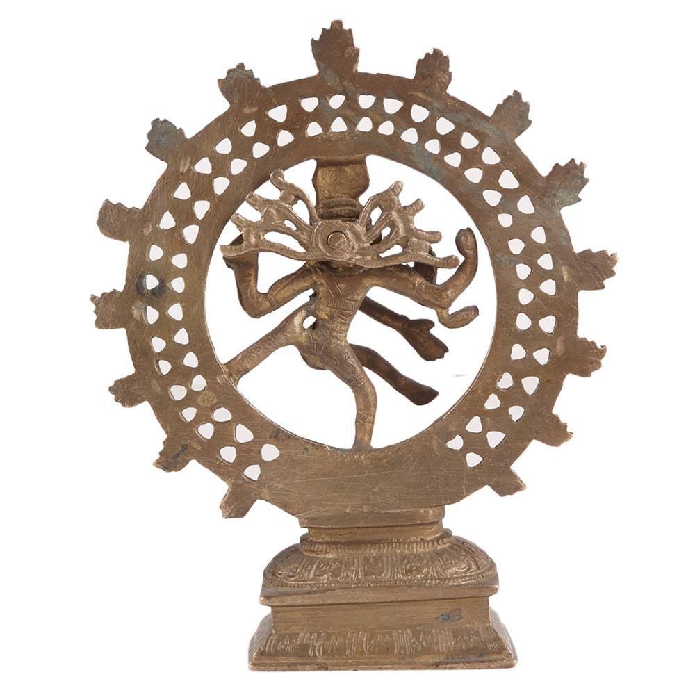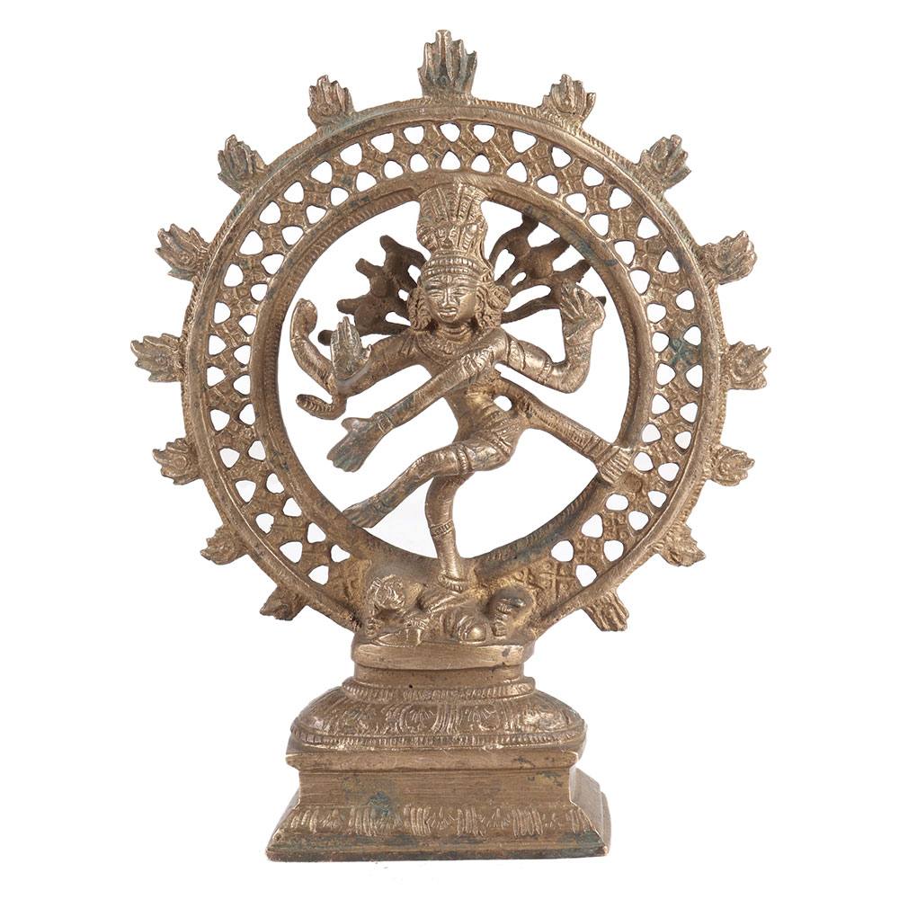 In this brass statue lord Shiva embraces those ideal physical characteristics while frozen in the present time of his dance within the cosmic circle of fire that is the universe's simultaneous and constant formation and ruination. The ring of fire that encircles the figure represents the encapsulated cosmos of mass, time, and space, whose never-ending cycle of extermination and renewal moves in sync with the beat of Shiva's drum and the rhythm of his moves.