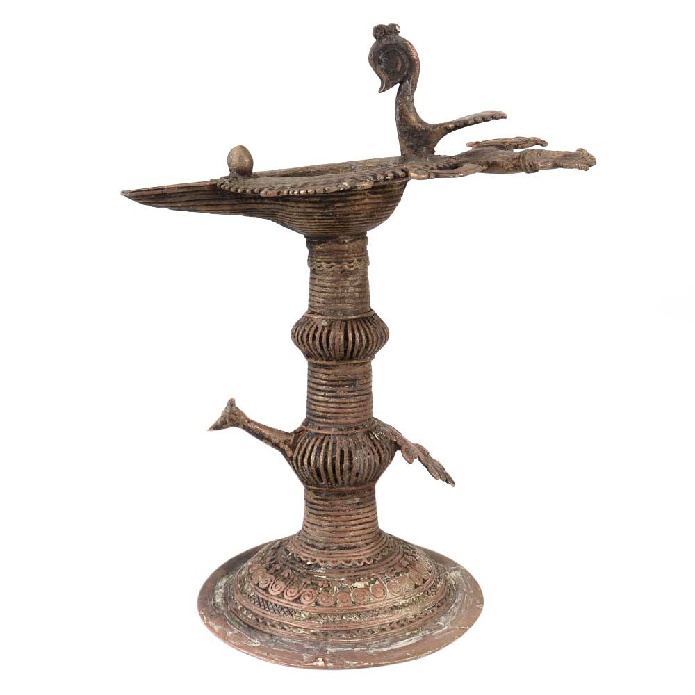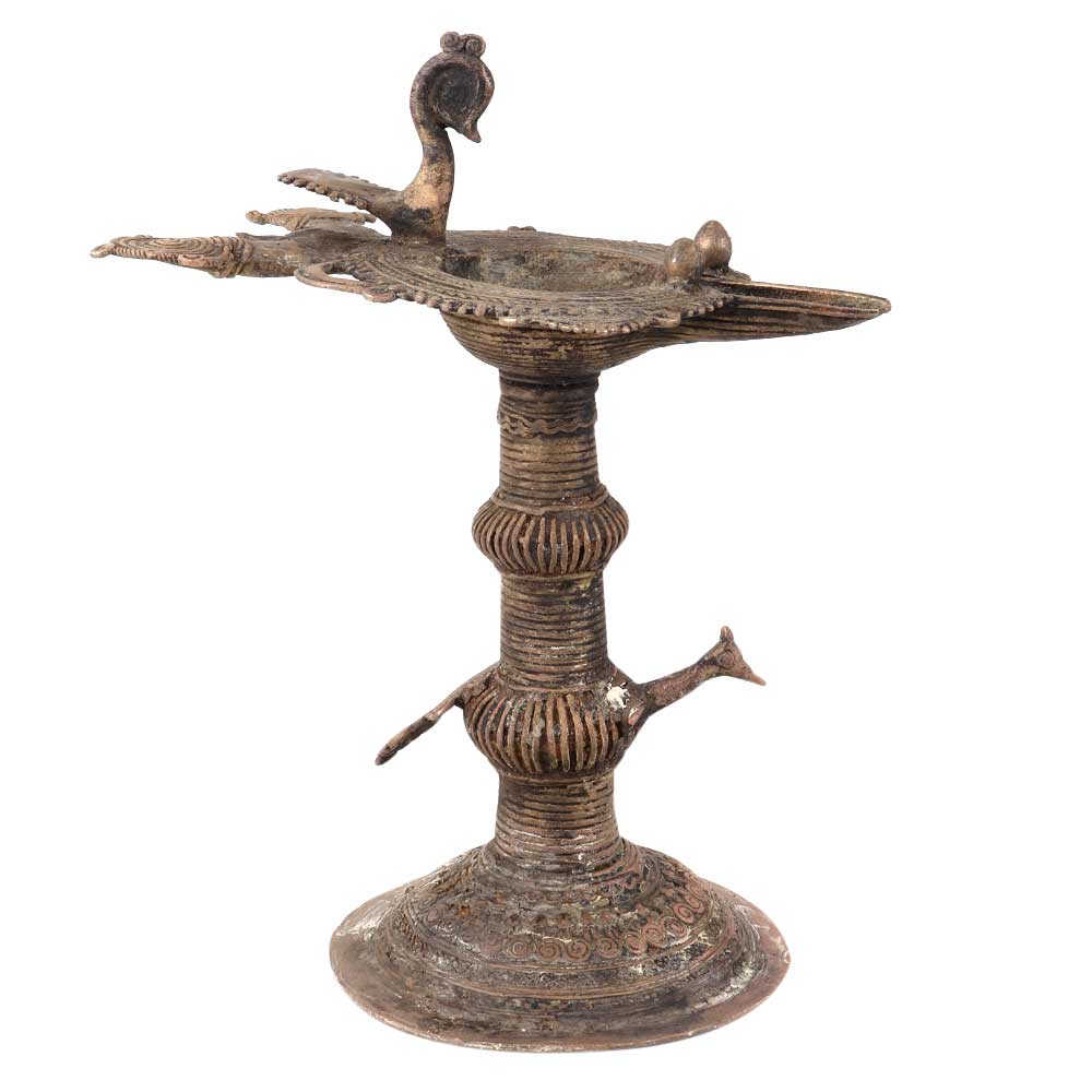 Handcrafted using old lost wax technique primarily practiced in Orrisa and West Bengals by the local or tribal artisans. In this technique the molten wax is poured into desired clay mould and when the wax melts the clay is broken and we get the desired metal object which is further polished to perfection. The Deep Cup Can Be Filled with Oil and Light a Cotton Wick. Diyas/ Oil Lamps are Considered Auspicious as in Hindu Religion. It is detailed with Elephant and Peacock Animals with Beautiful Details.