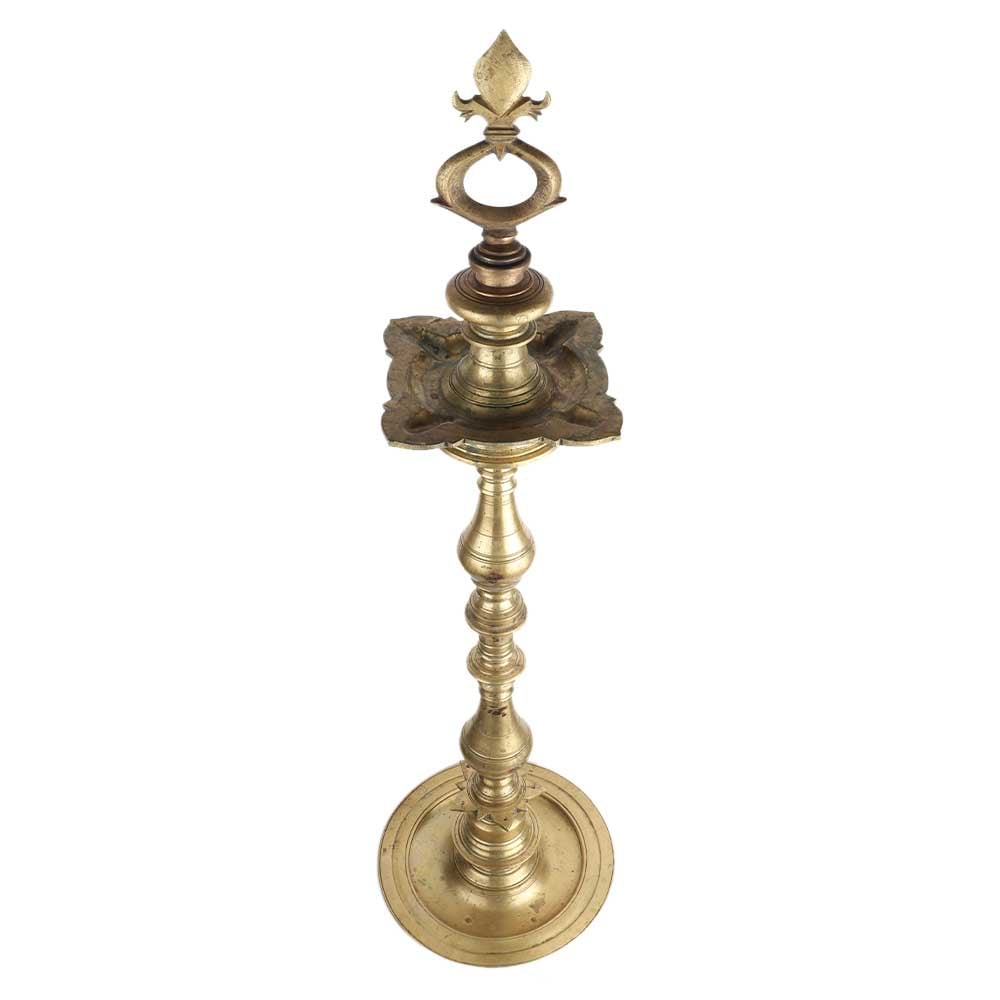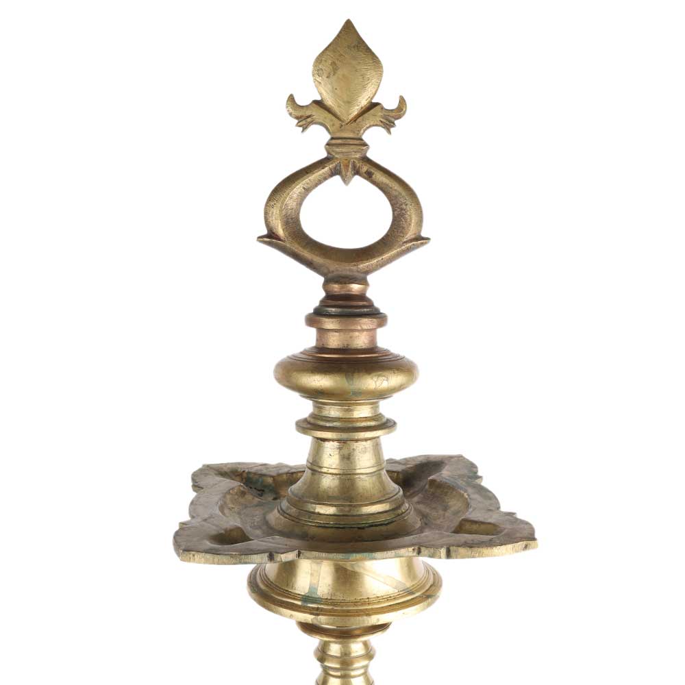 Handmade south indian brass oil lamp with a decorative finial and 4 wicks oil container with a circular base. Diwali decoration, stage decoration, inaugural event decoration, weddings, housewarming ceremonies and other auspicious events. Gift for near and dear ones.
