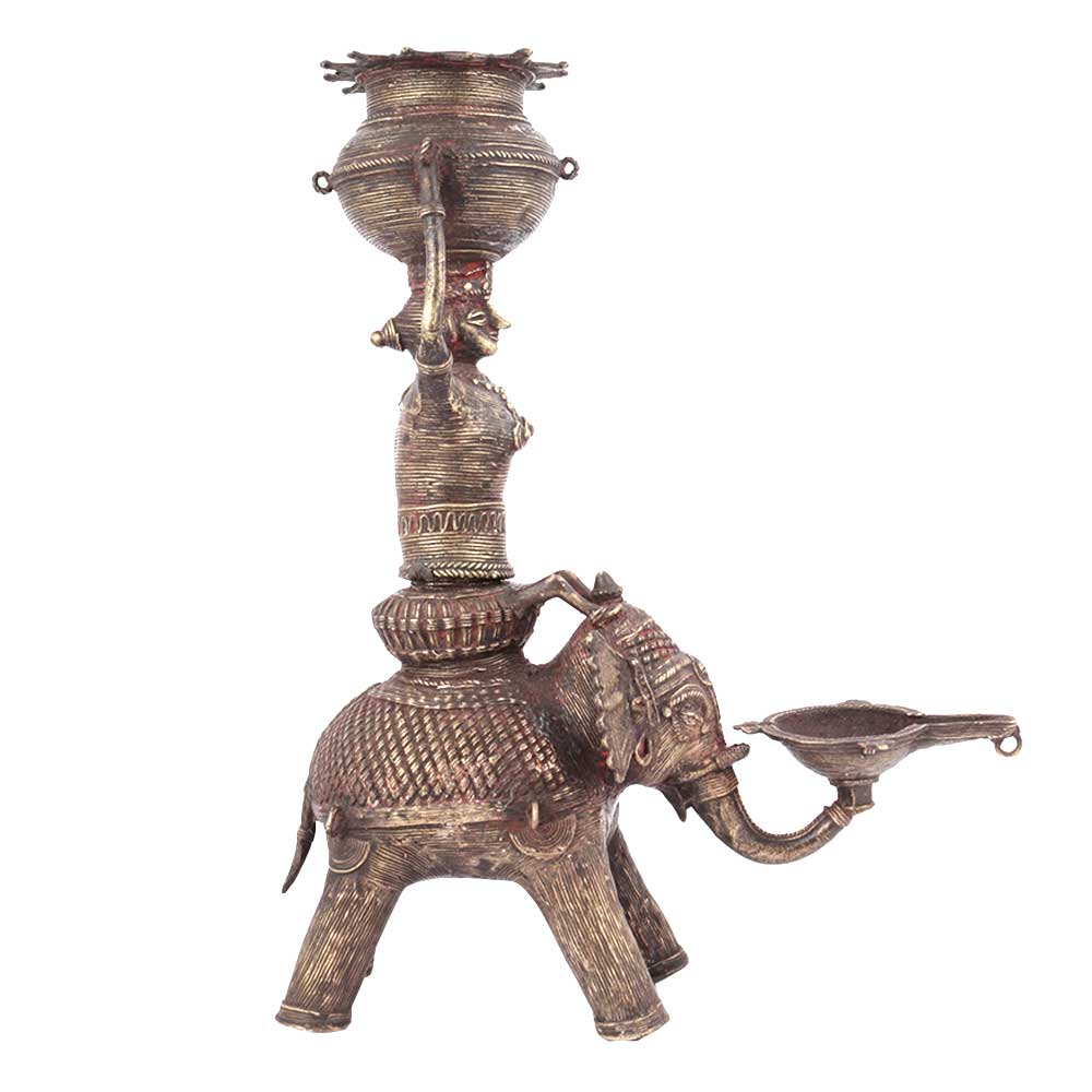 Brass Oil Lamp with Bowl Being Held by a Woman on Elephant