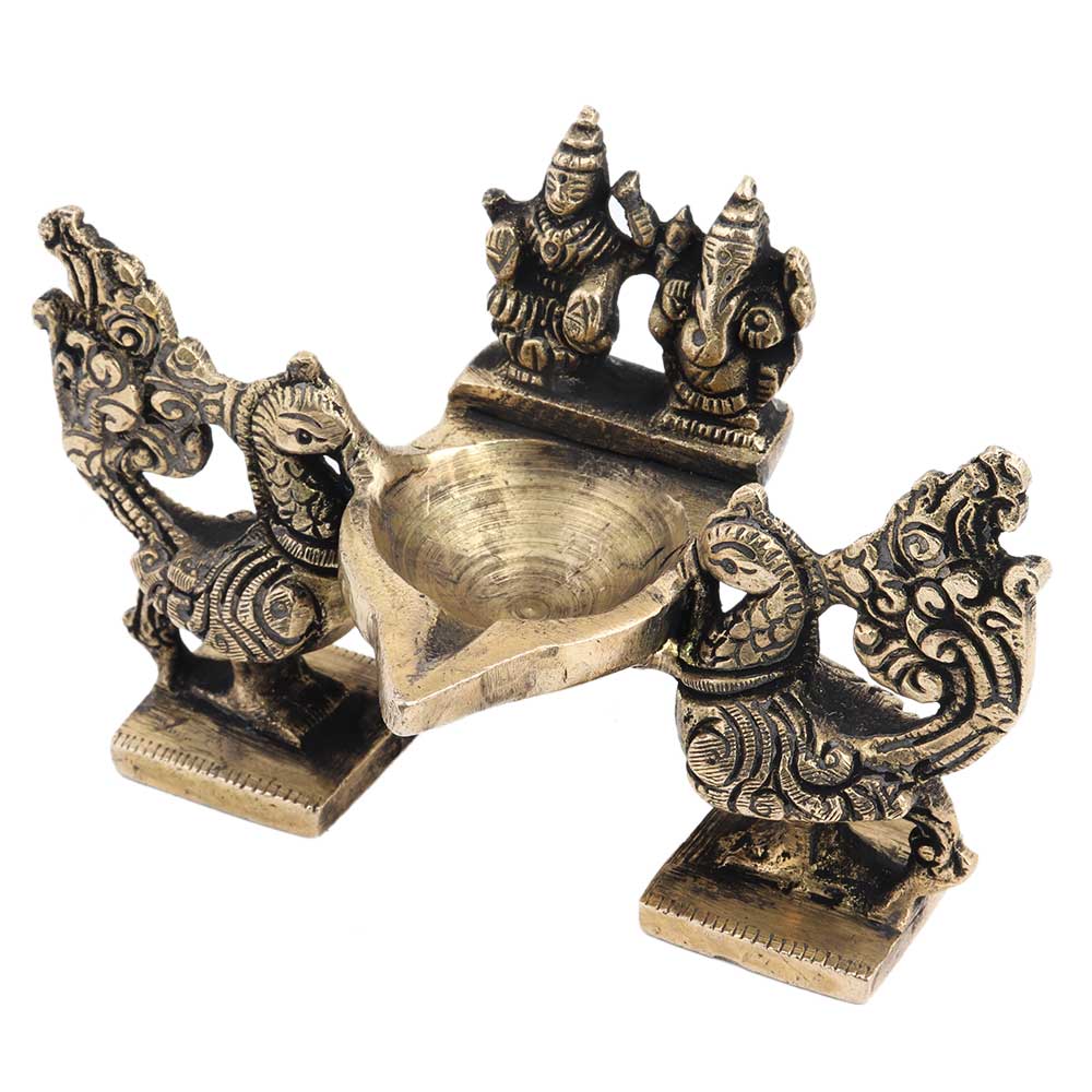 Elaborate and simply classy brass oil lamp with Lord ganesha ,Goddess Laxmi And twin peacock figurines holding the Diwali diya, wedding Diya. Gift for special auspicious occasions for your near and dear ones.