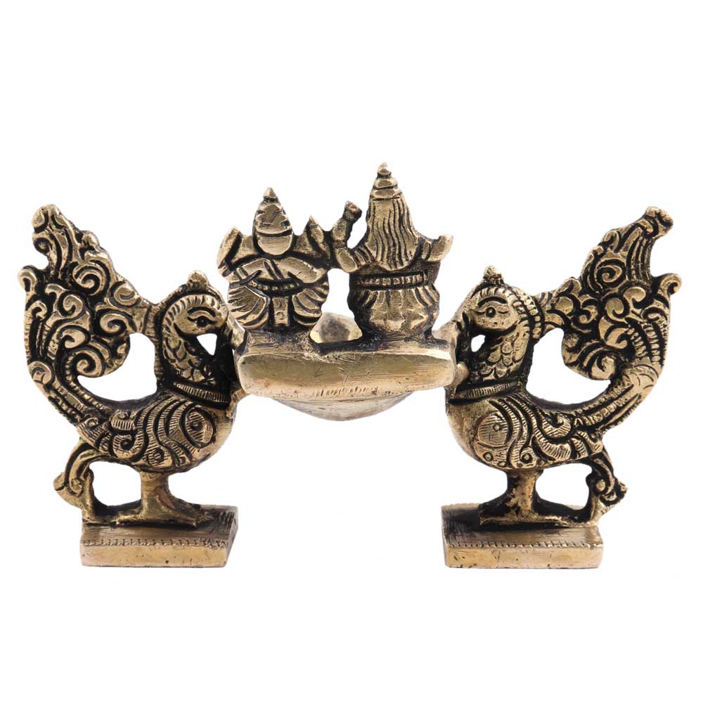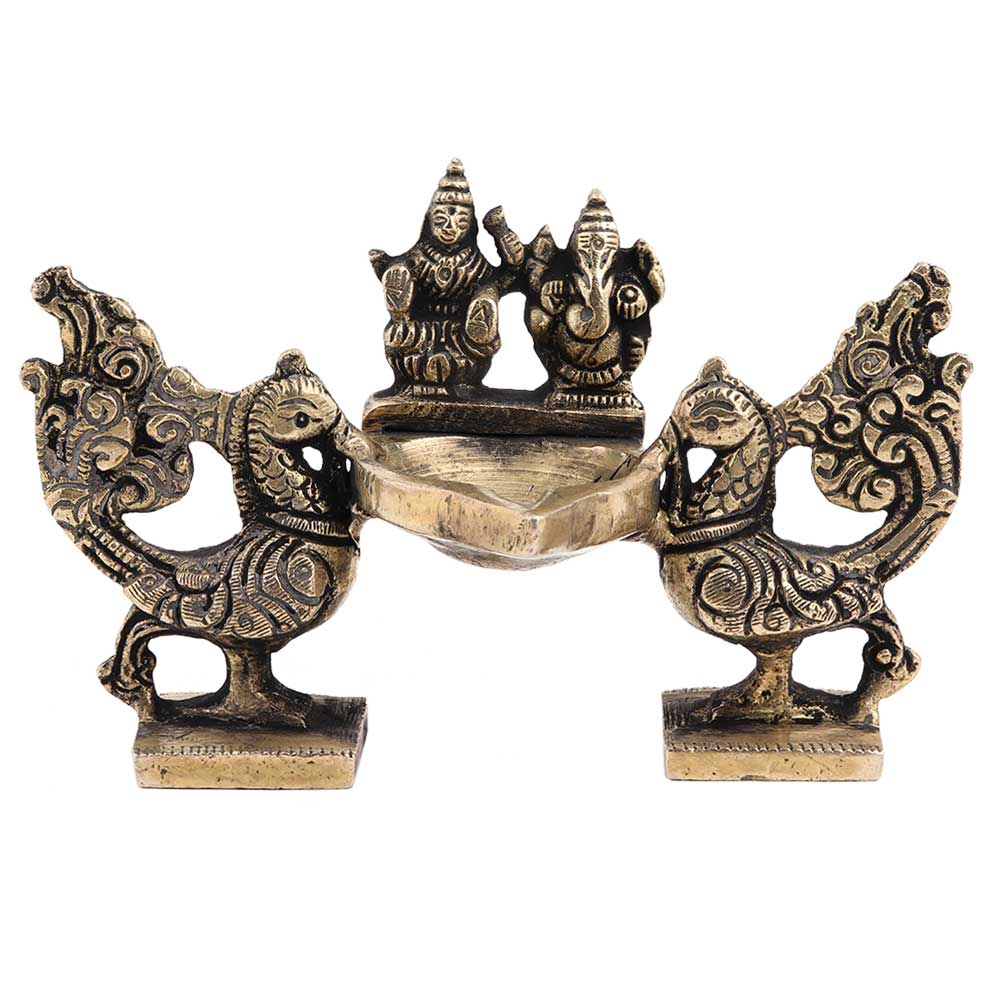 Brass Oil Lamp With Laxmi Ganesha And Twin Peacocks Statue Festive Diya